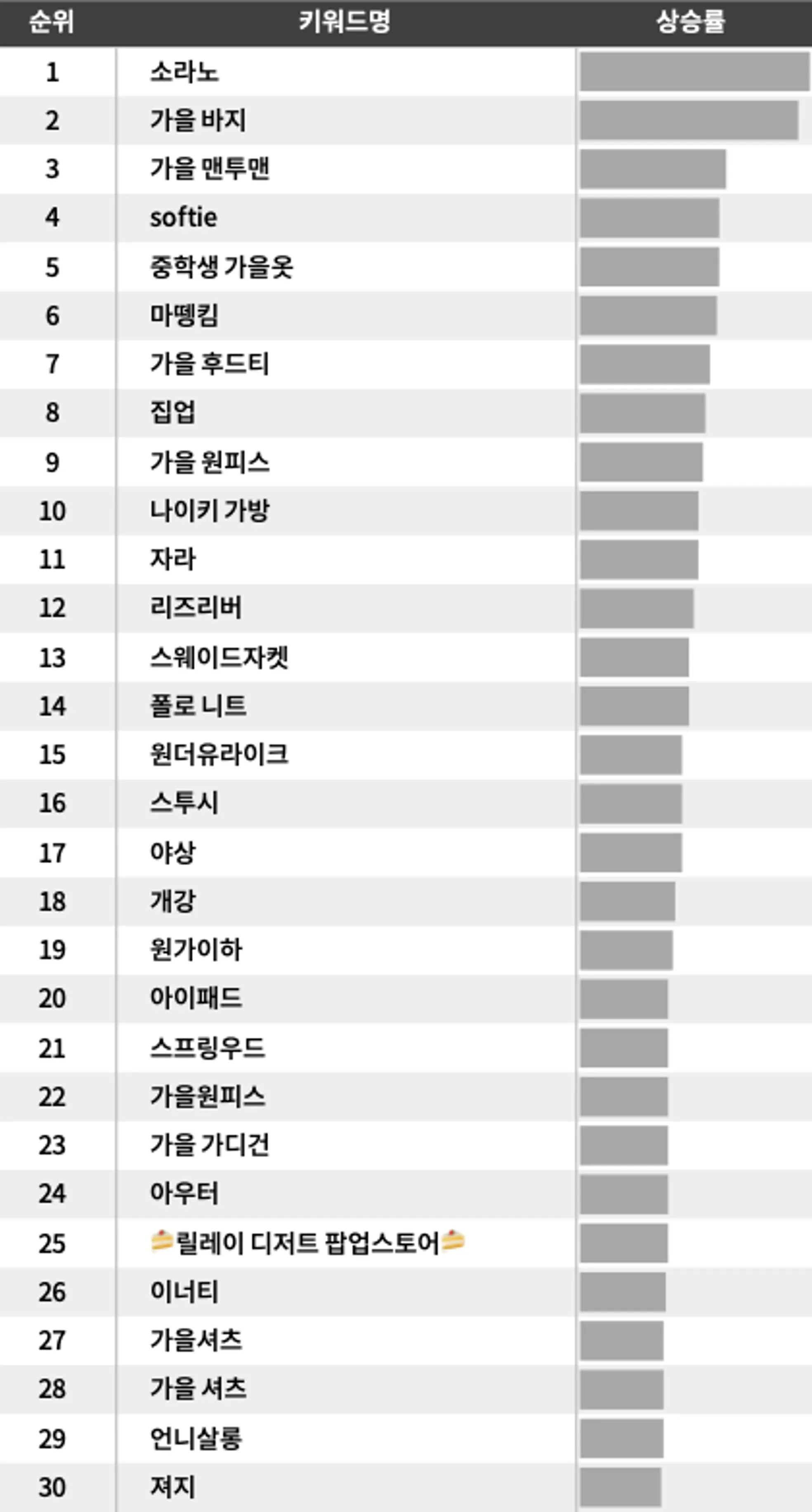 10순위 안에 가을 관련 키워드가 대거 등장하며 본격적으로 가을 신상품에 대한 관심이 상승하고 있습니다! 이번 주 가을 키워드를 활용해 가을 광고 캠페인을 시작해 보세요!