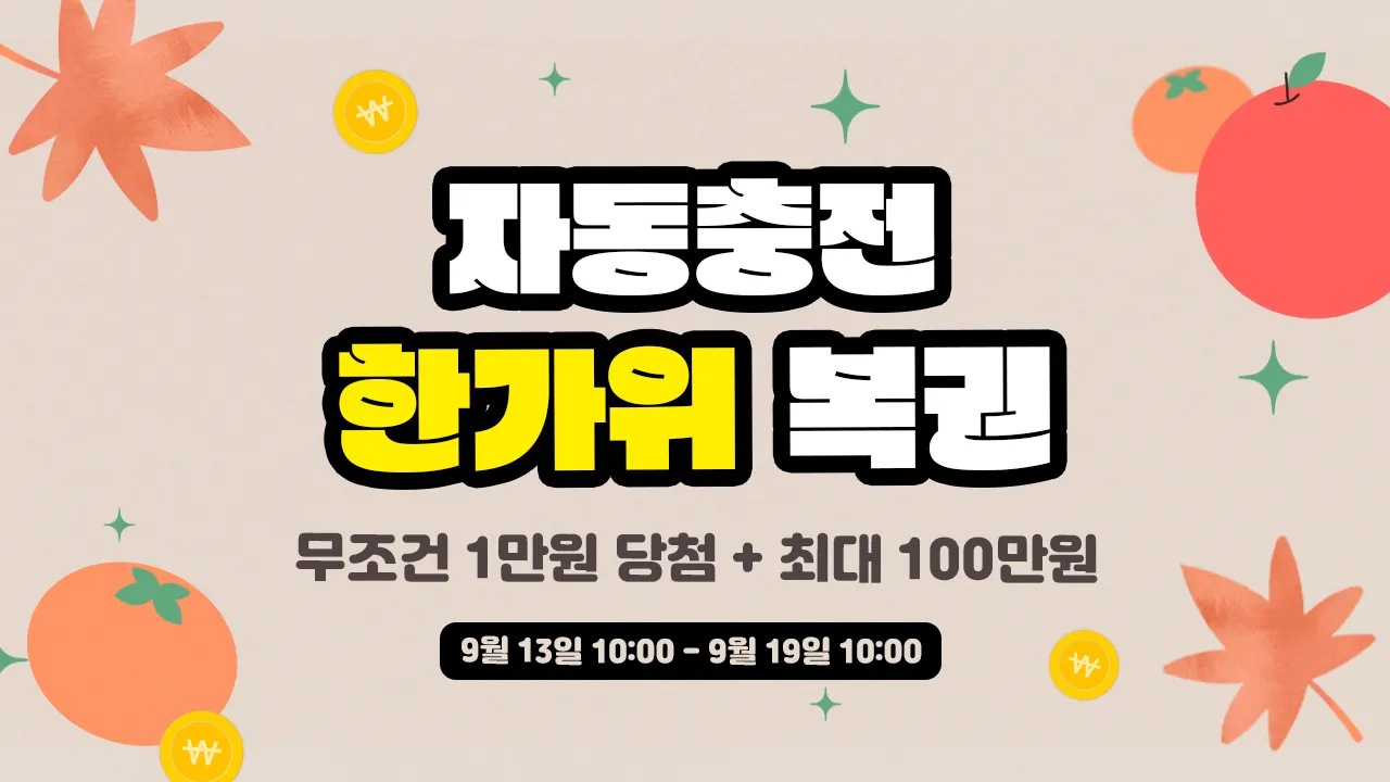 추석 연휴 기간 자동충전을 등록해 횟수를 채우시면 무조건 복권 1만원 당첨 + 최대 100만원 금액의 페이백을 지급해 드립니다!