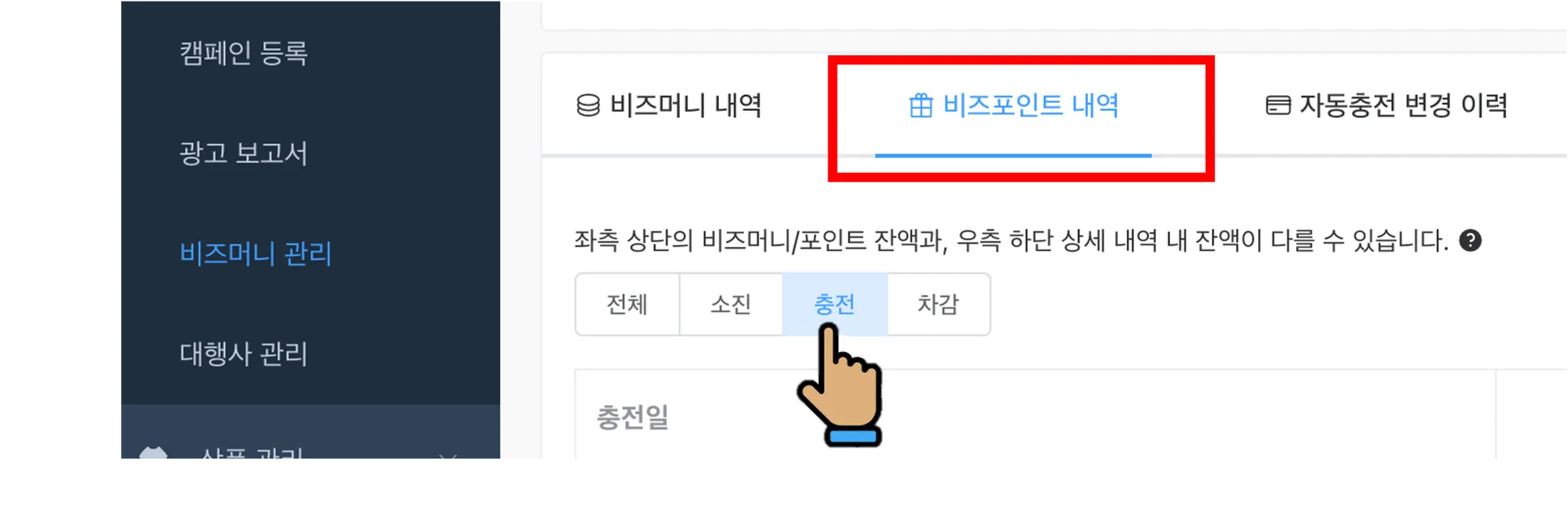셀러어드민 내 [광고 관리 - 비즈머니 관리] 탭에서 확인 가능하십니다.
