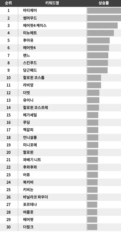 이번 주 가을 급상승 키워드는 할로윈에 대한 키워드가 처음 등장했는데요! 키워드를 다양하게 활용해 남은 10월 달 상품 노출을 위한 광고를 꾸준히 운영해 보세요!