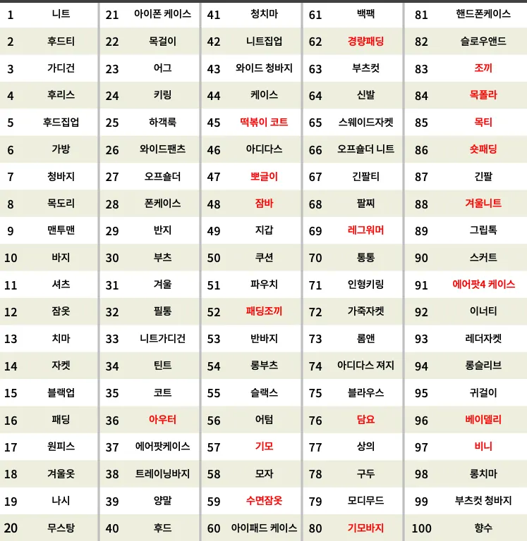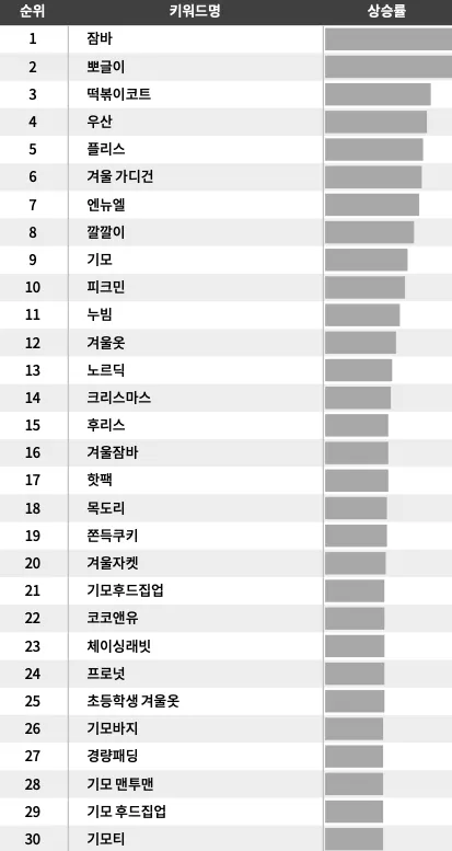 기온이 많이 내려간 이번 주, 급상승 키워드에 두툼한 기모 관련 키워드가 대거 등장했는데요! 고객님들이 많이 탐색한 키워드를 다양하게 활용해 상품 노출을 위한 광고를 꾸준히 운영해 보세요!