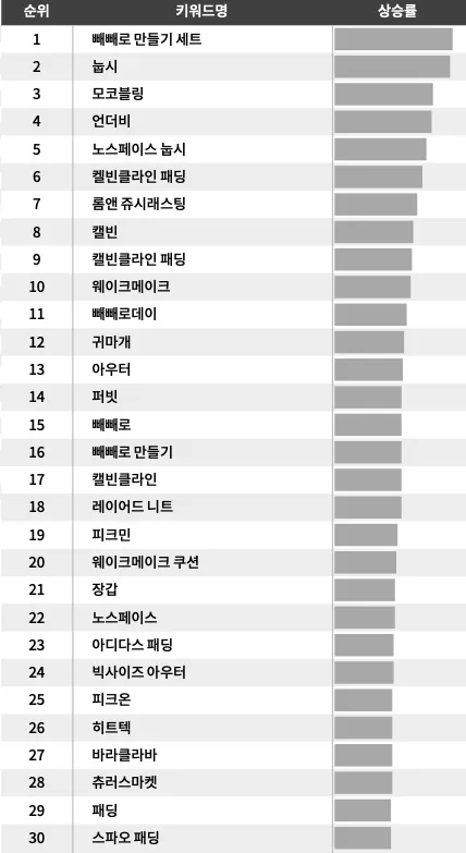 본격적인 겨울 날씨로 인해 급상승 키워드에 패딩 관련 키워드가 여러 등장했는데요! 고객님들이 많이 탐색한 키워드를 다양하게 활용해 상품 노출을 위한 광고를 꾸준히 운영해 보세요!