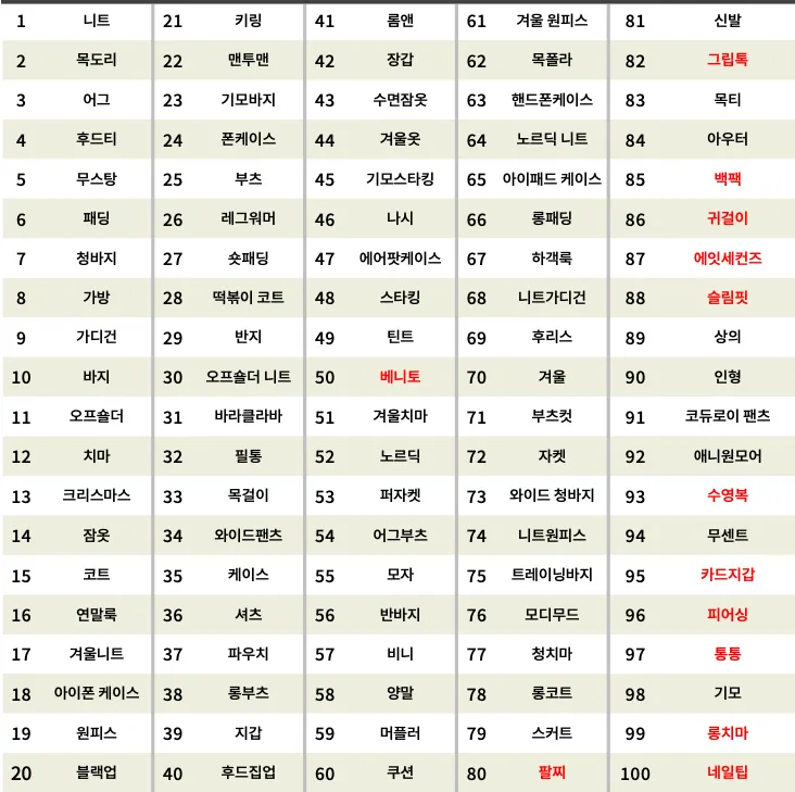 패션 포인트로도 딱 좋고, 크리스마스 선물로 제격인 카드지갑, 귀걸이 등을 많이 탐색하셨습니다. 이와 더불어 이번 연말, 모임 대신 해외여행 선호도가 높아짐에 따라 따뜻한 여행지에서 입을 수 있는 수영복 키워드도 급상승하였습니다!