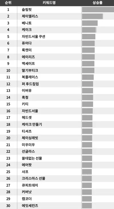 이번 주는 다가오는 크리스마스를 맞이하여 선물 관련 키워드가 여러 등장하였습니다. 고객님들께서 많이 탐색한 관련 아이템을 다양하게 활용해 상품 노출을 위한 광고를 꾸준히 운영해 보세요!