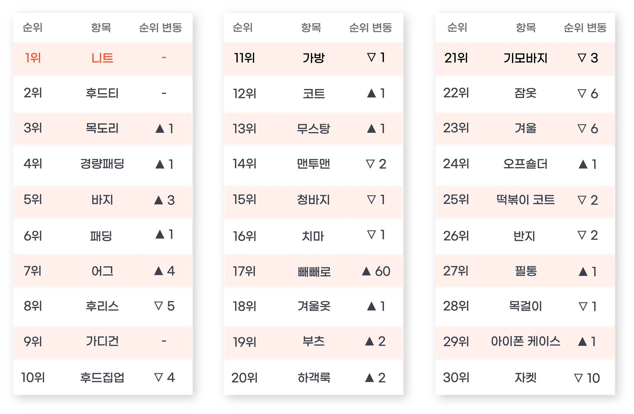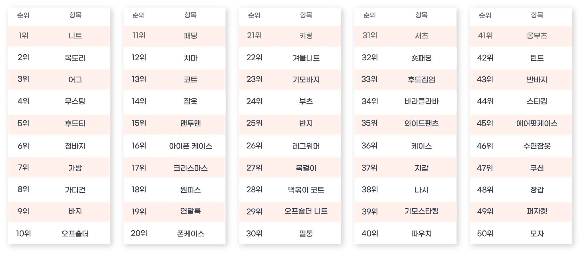 금주 인기 키워드: 빼빼로, 니트, 패딩, 목도리, 어그, 부츠, 하객룩