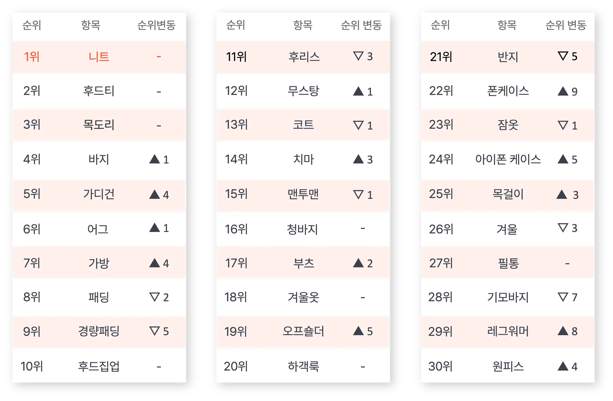 금주 인기 키워드: 가디건, 니트, 패딩, 목도리, 어그, 부츠