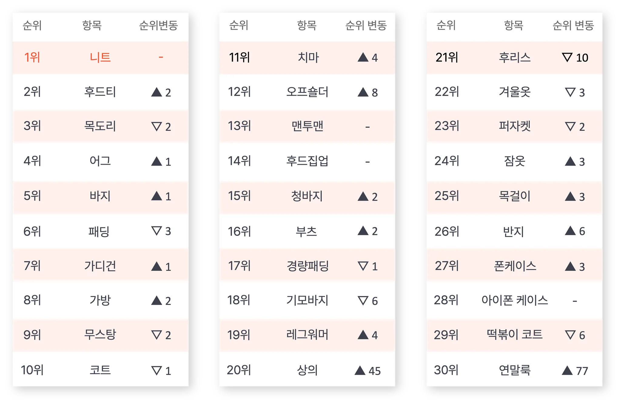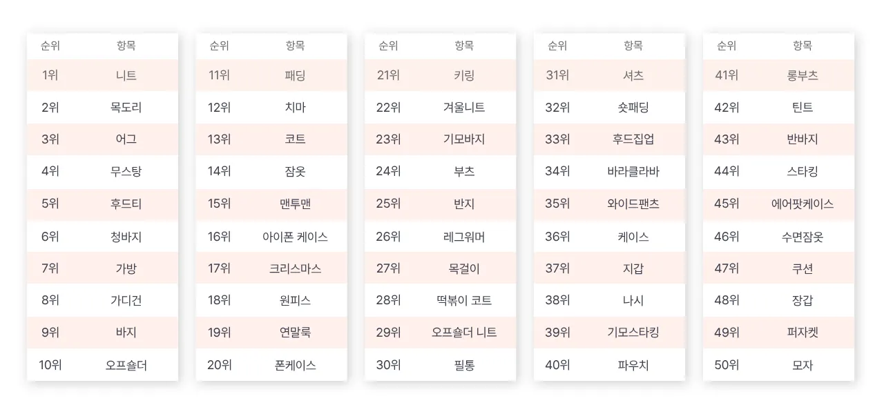 금주 인기 키워드: 연말룩, 오프숄더, 니트, 후드티, 목도리, 어그