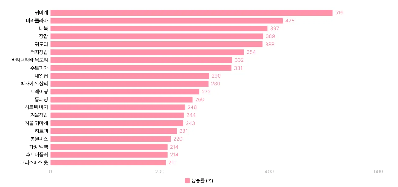 금주 급상승 키워드 : 귀마개, 바라클라바, 내복, 장갑, 트레이닝, 네일팁