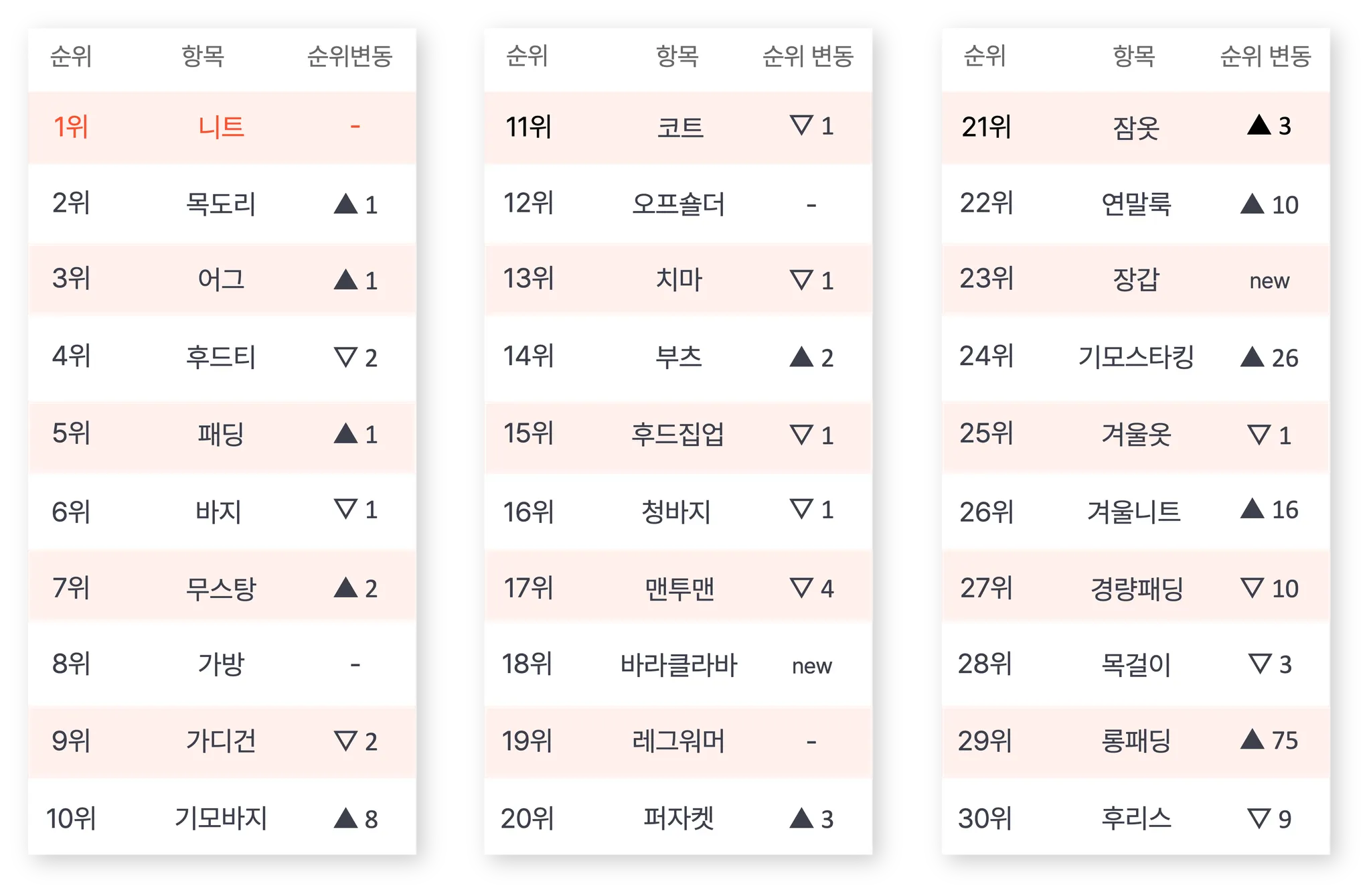 금주 인기 키워드: 어그, 연말룩, 무스탕, 니트, 기모, 장갑, 잠옷