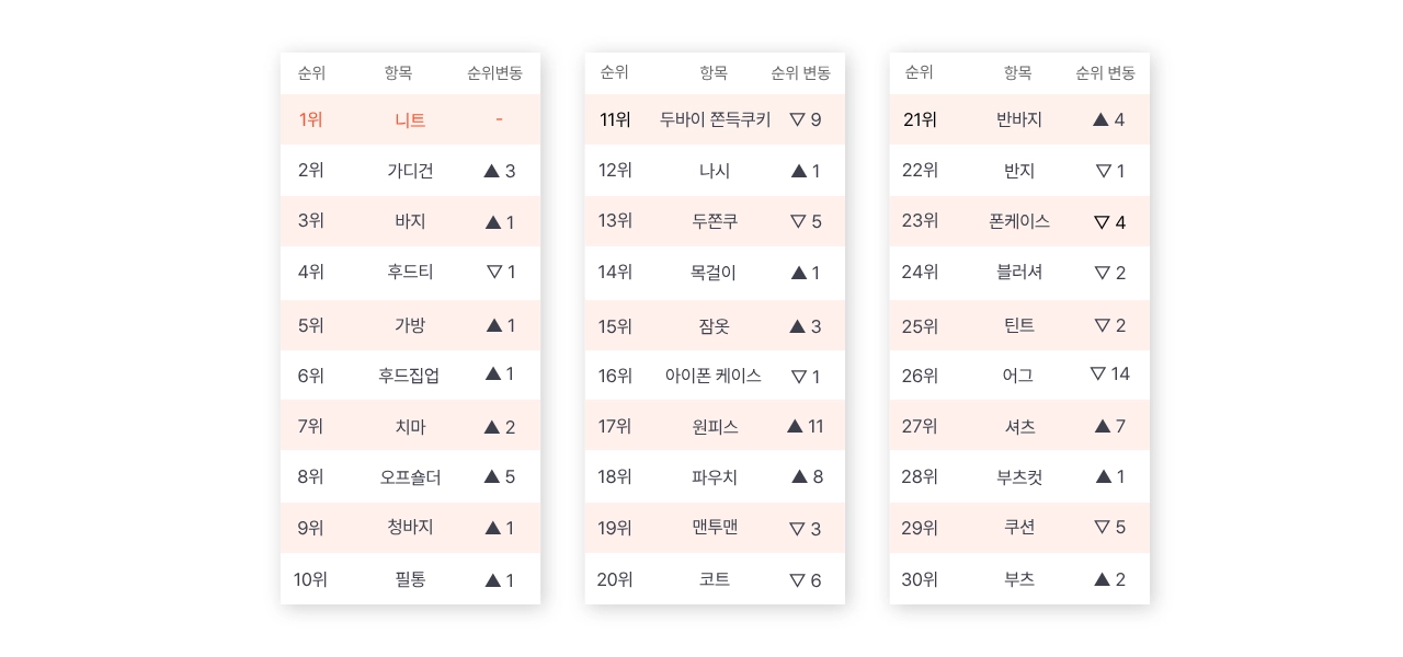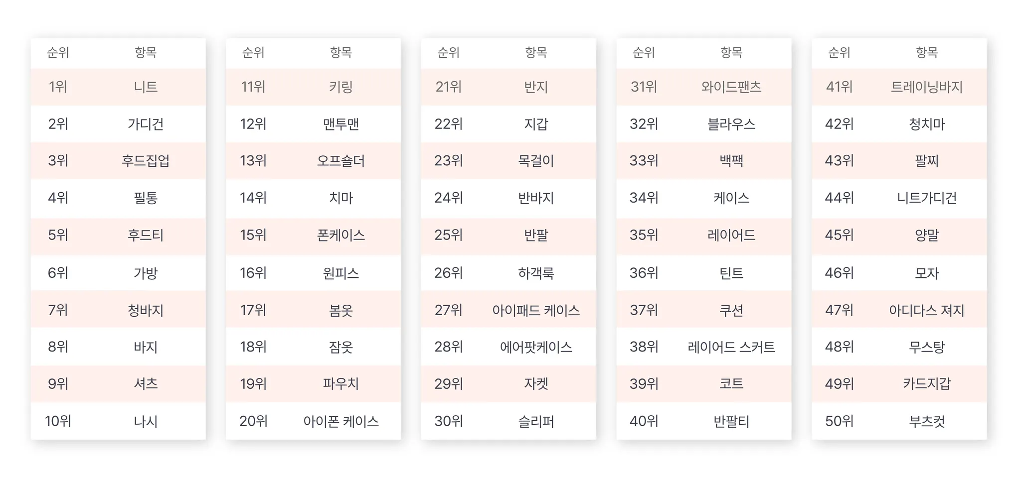 금주 인기 키워드: 니트, 가디건, 바지, 치마, 원피스, 반바지, 셔츠, 파우치