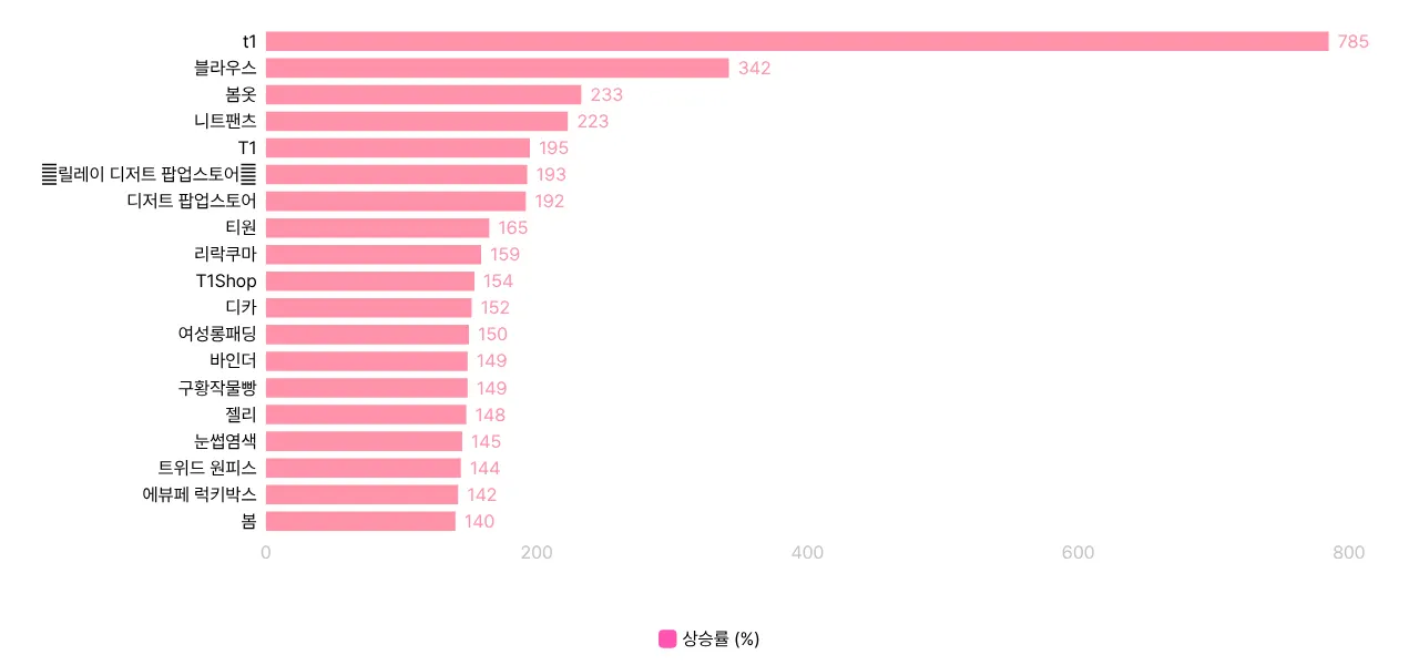 금주 급상승 키워드 : t1, 블라우스, 봄옷, 니트팬츠, 디저트, 원피스