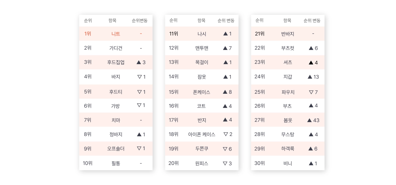 금주 인기 키워드: 봄옷, 니트, 가디건, 후드집업, 맨투맨, 폰케이스, 반지, 부츠컷, 셔츠, 지갑, 하객룩
