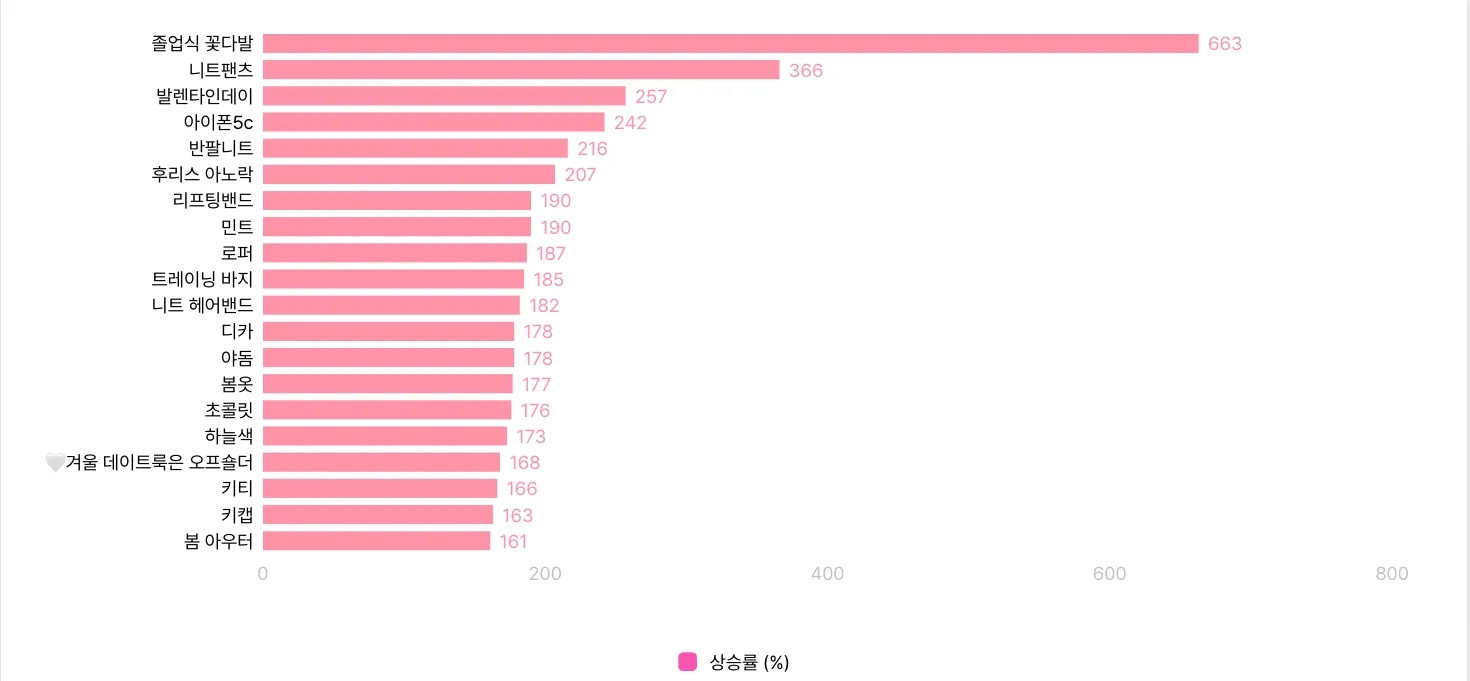 금주 급상승 키워드 : 졸업식 꽃다발, 니트팬츠, 발렌타인데이, 반팔 니트, 후리스 아노락, 리프팅밴드