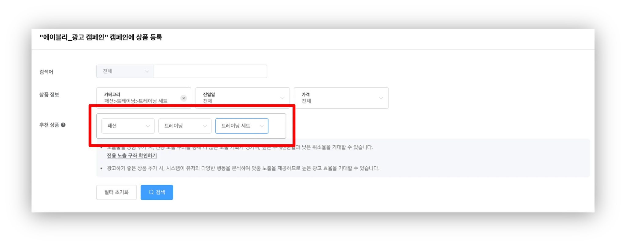 예를 들어, 이번 주 트렌드 키워드가 ‘운동복’이라면, 카테고리 기능을 활용해 내 마켓의 운동복·트레이닝 관련 상품을 선택하여 광고 노출이 가능해요.