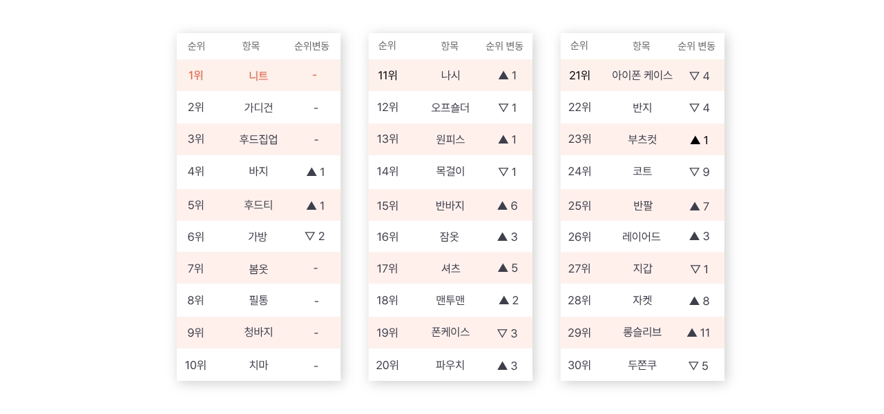 새학기, 개강 시즌에 맞게 봄 아우터(▲267%), 봄 가디건(▲173%), 봄 니트(▲170%), 롱슬리브(▲11위), 봄 상의(▲192%) 등 봄 아이템이 크게 상승하고 있습니다.