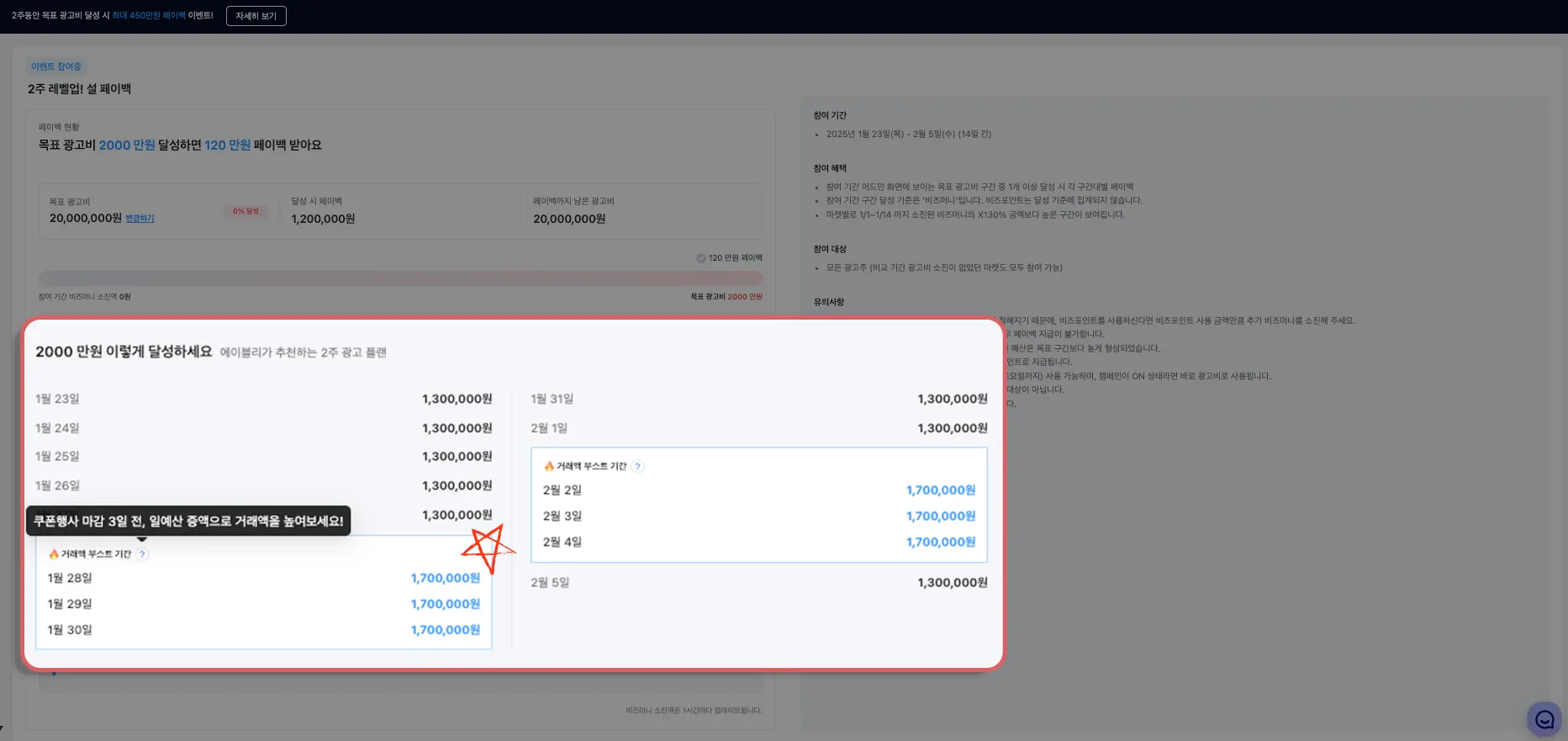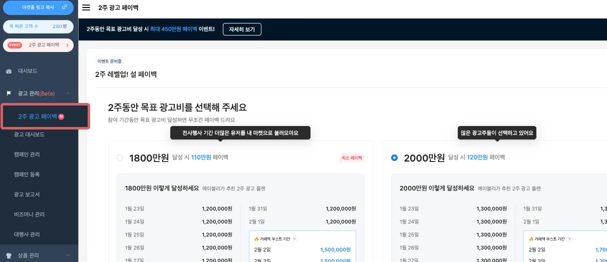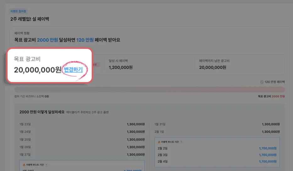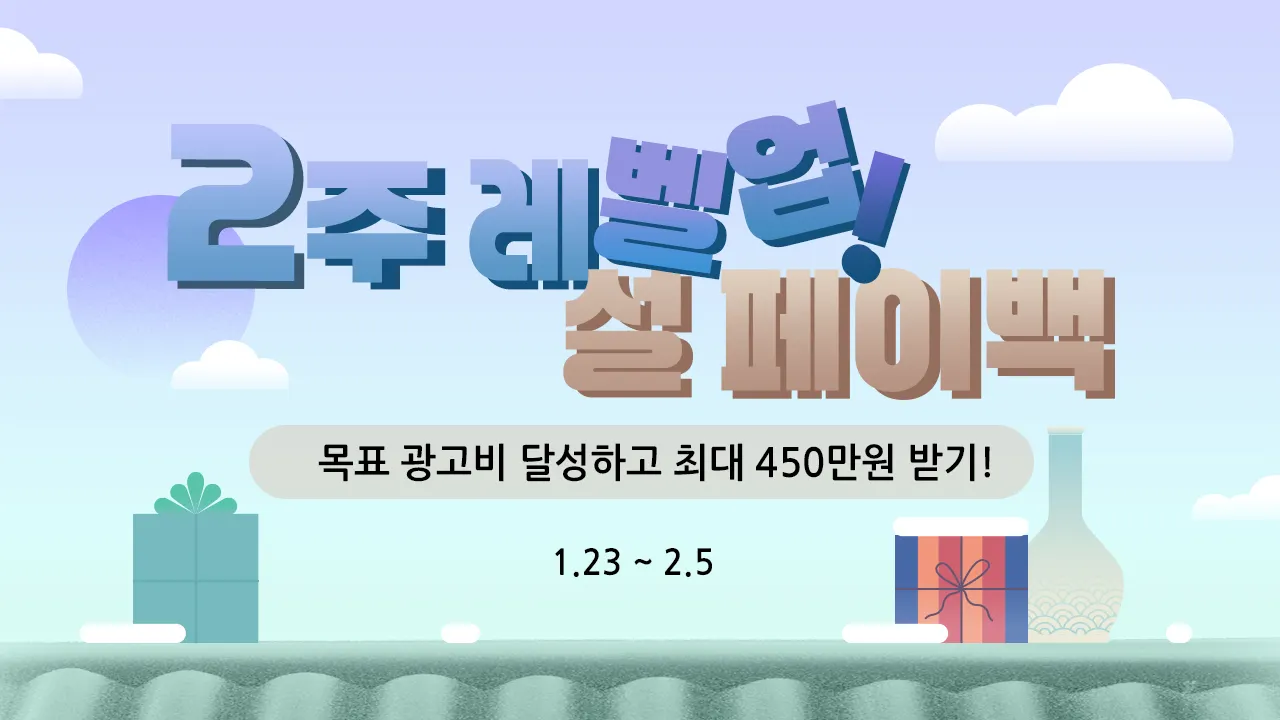 행사 기간 2주 동안 고객을 더 확보할 수 있도록 새로운 광고 페이백을 준비했습니다!