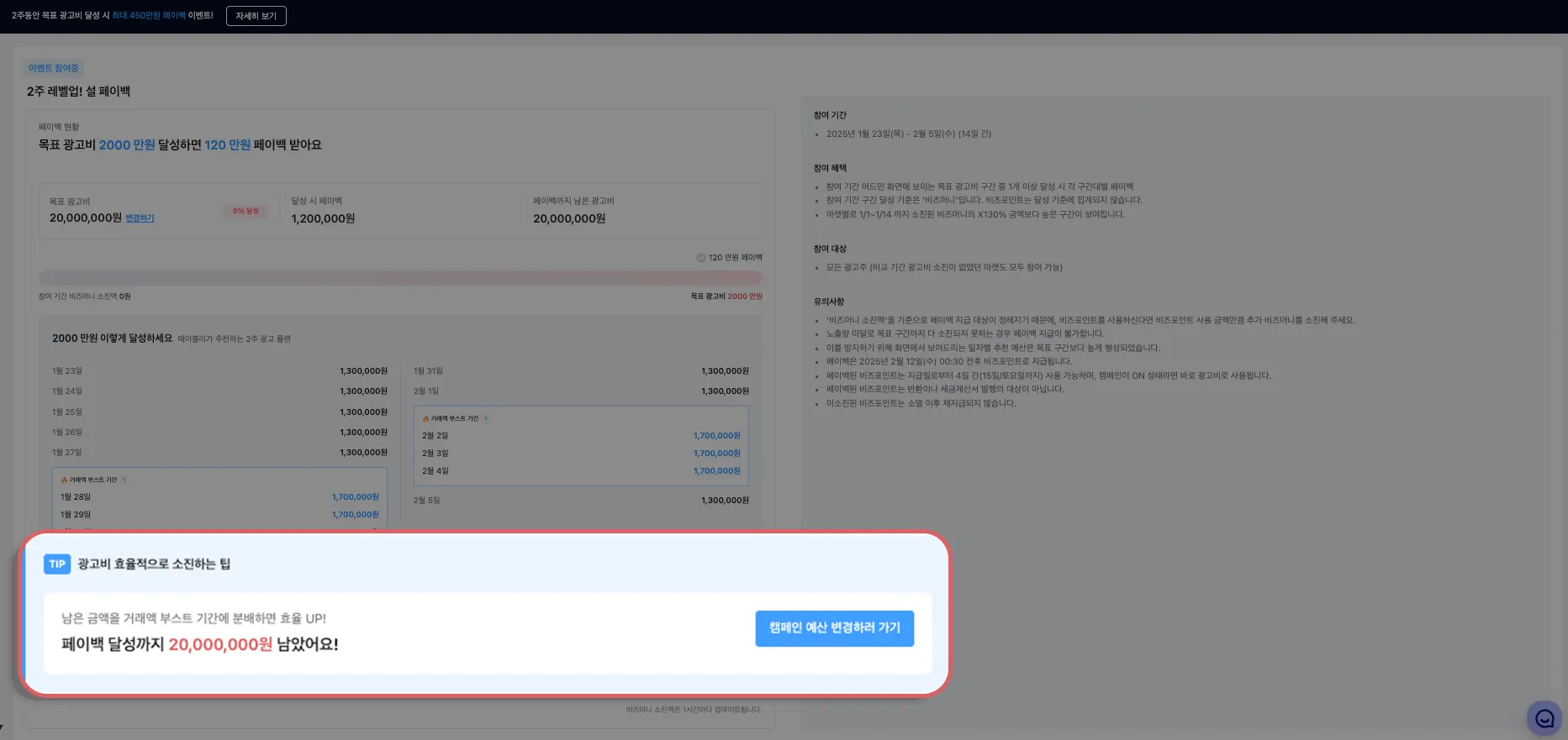 목표 광고비(비즈머니) 구간까지 다 소진되지 못하는 경우에는 페이백 지급이 불가합니다.