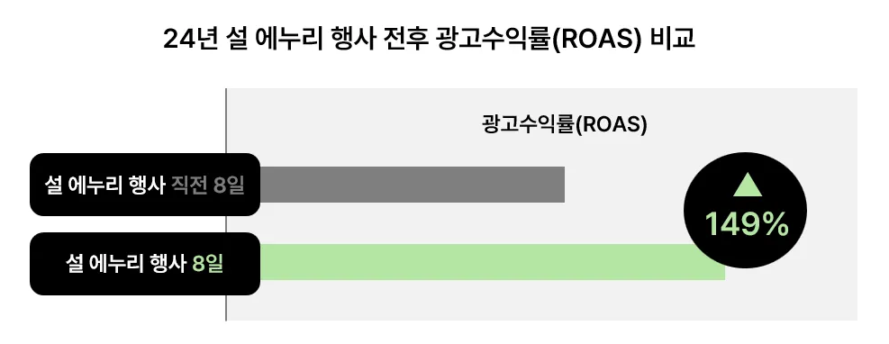 2024년 설 에누리 행사 기간 고객님들의 방문이 급증하면서 광고수익률(ROAS)도 따라서 급증하였고, 이는 거래액과 이어졌습니다.