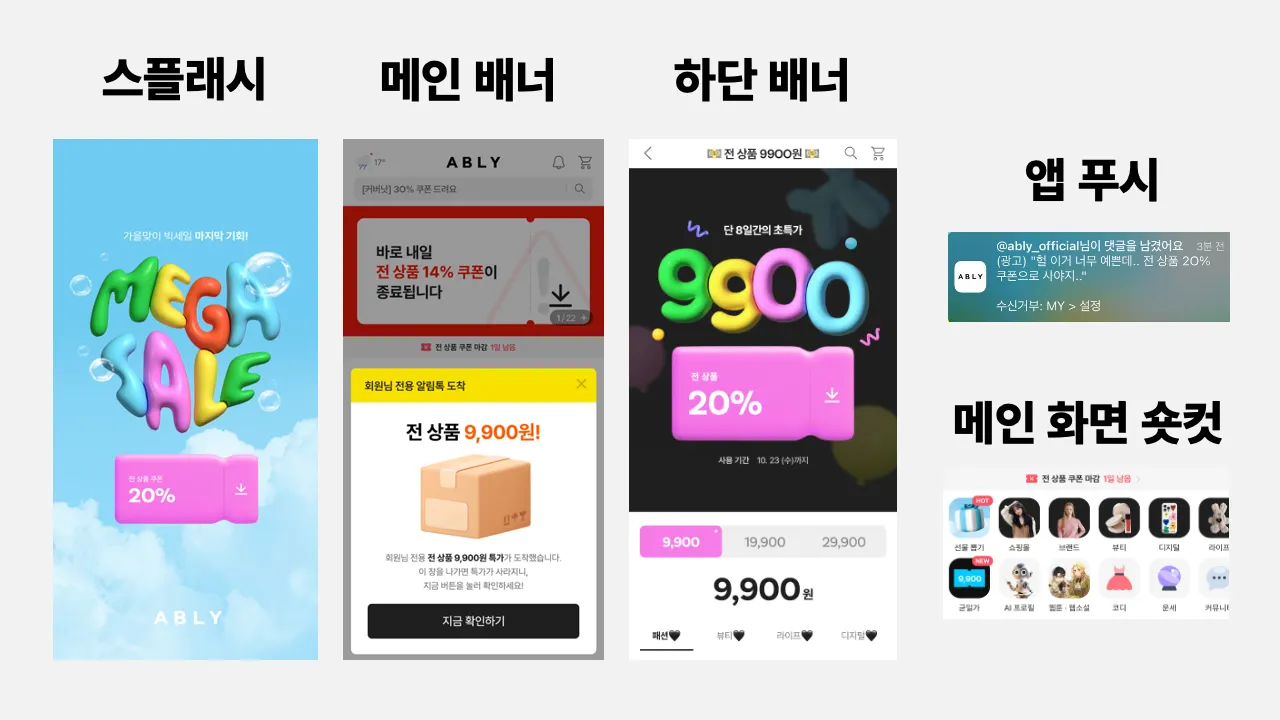 전상품 메가세일 마지막 날인 오늘은 쿠폰을 놓치시는 고객님들이 없도록 투데이 메인 배너, 하단 팝업, 스플래시, 앱 푸시, 숏컷 노출 등을 진행하고 있는데요!