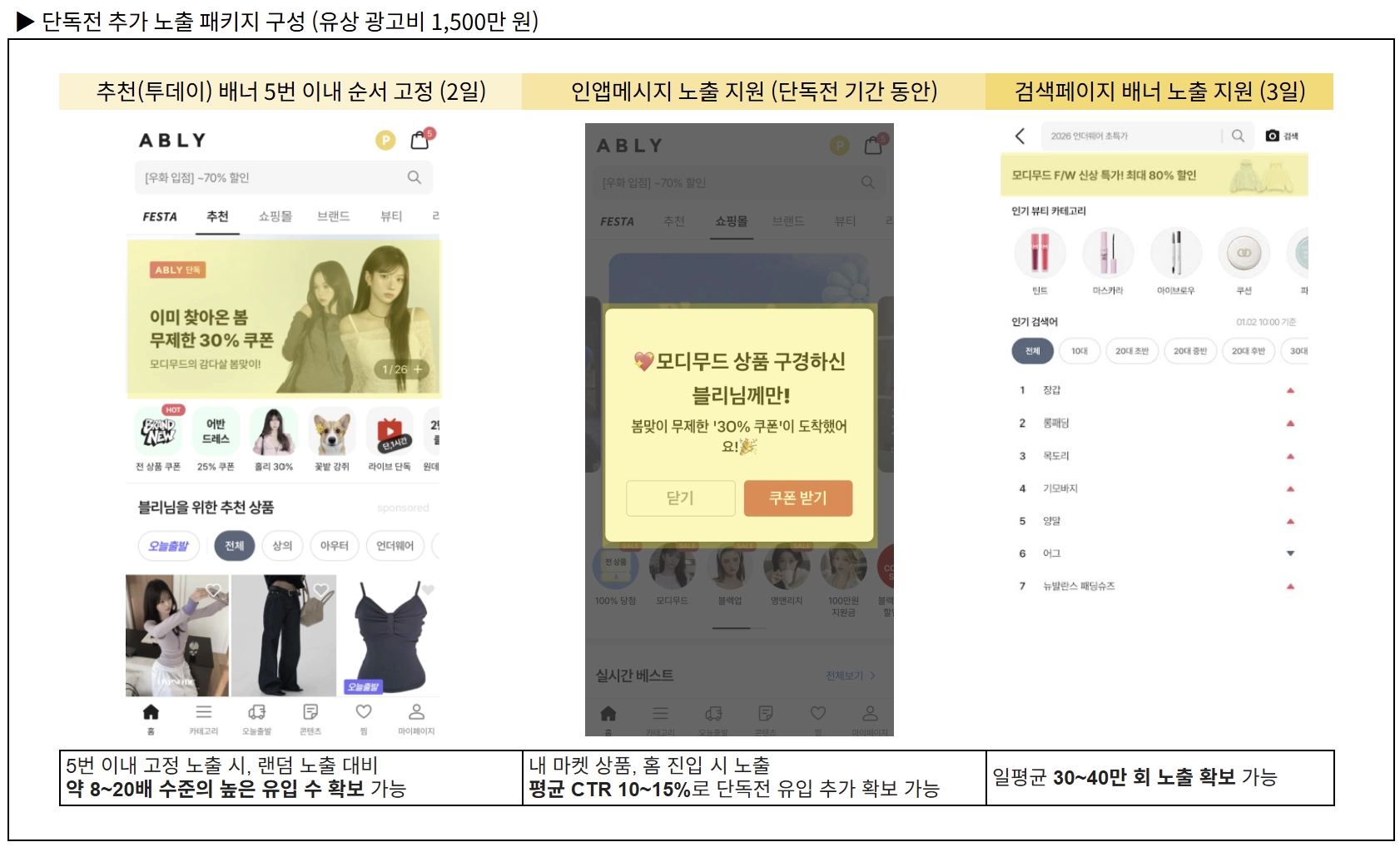→ 2분기 내 단독전 진행 시, 유상 광고비 1,500만 원 가치의 단독전 추가 노출 패키지 제공