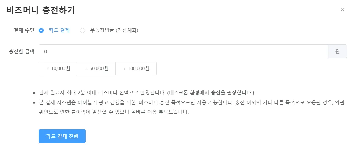 * 광고비 결제 화면 (셀러 어드민 - 광고 관리 - 비즈머니 관리)