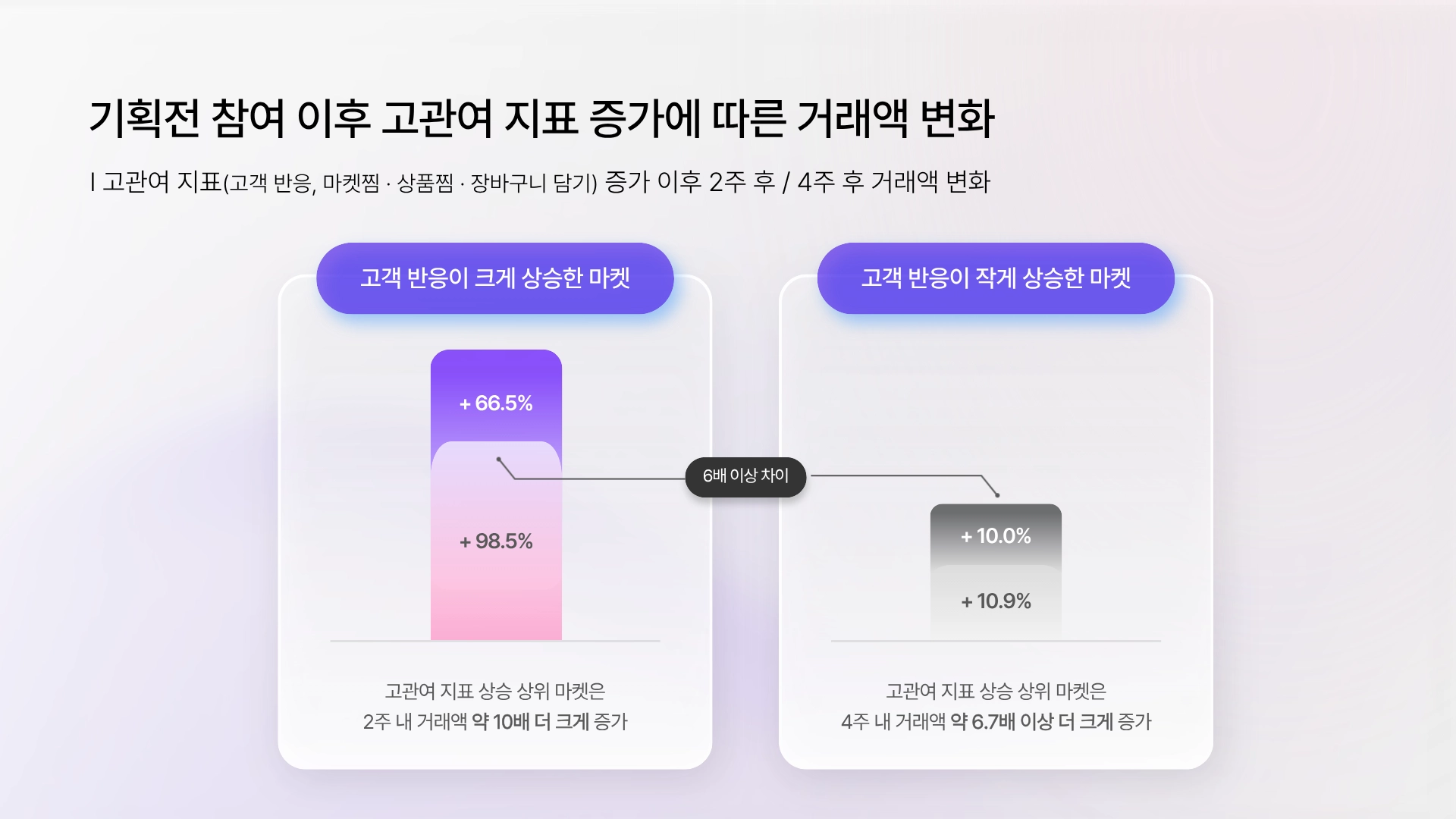 고객 반응(*고관여 지표)이 크게 상승한 증가폭이 큰 마켓일수록 이후 거래액 상승폭도 함께 커지는 패턴이 확인되었어요.
