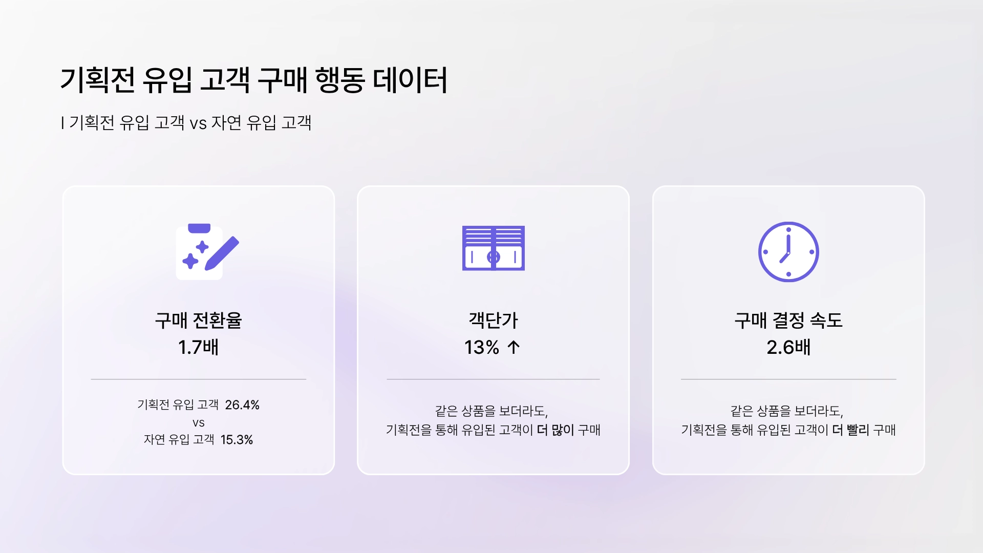 기획전 유입 고객과 자연 탐색으로 유입된 고객의 구매 행동을 비교해보면 차이가 분명하게 나타나요.