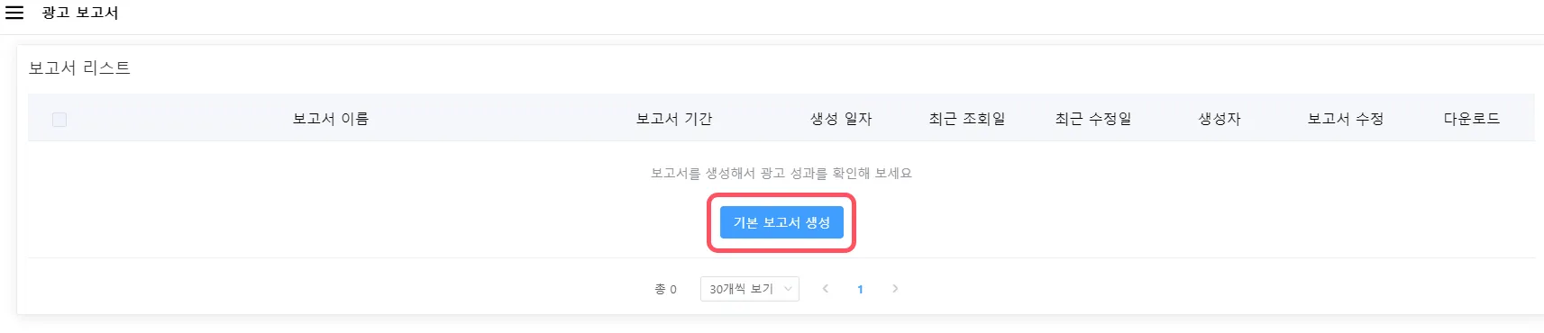 보고서 리스트에서 ‘기본 보고서’가 생성되었음을 알 수 있습니다.