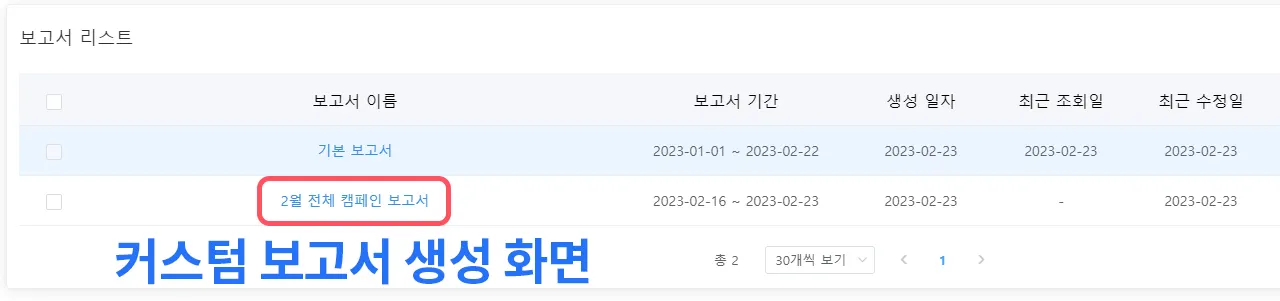 기본 보고서와 달리 보고서 이름(2)을 직접 입력해 주세요 ex) 2월 전체 캠페인 보고서
