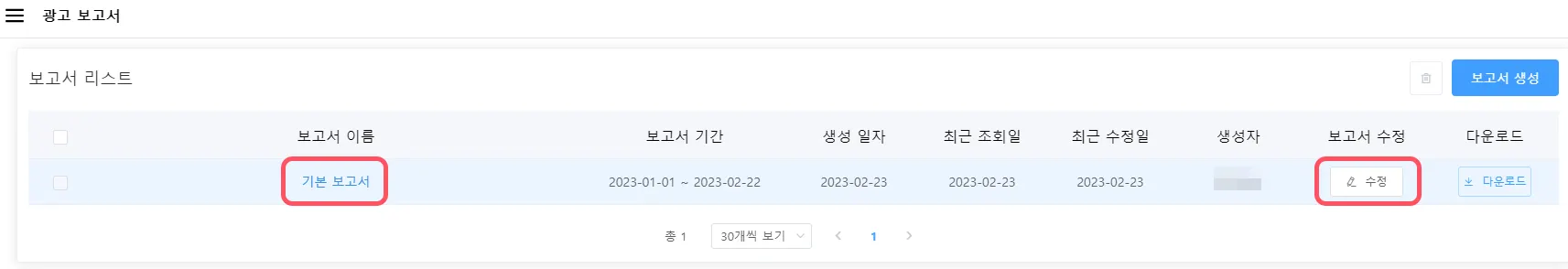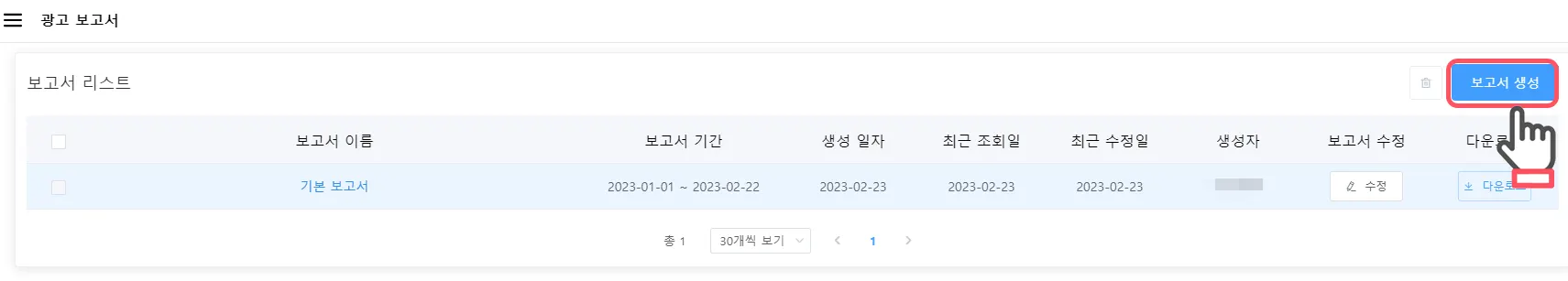 보고서 생성 : 보고서 리스트에 ‘기본 보고서’가 생성되고, 수시로 조회/수정할 수 있습니다.