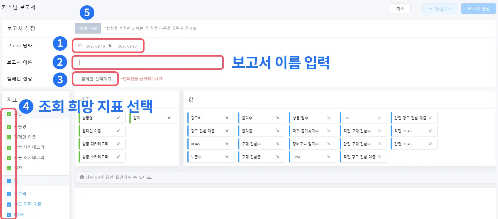 커스텀 보고서 : 세부적인 광고 성과 분석을 위한 다양한 지표 제공 (지표 선택 가능)
