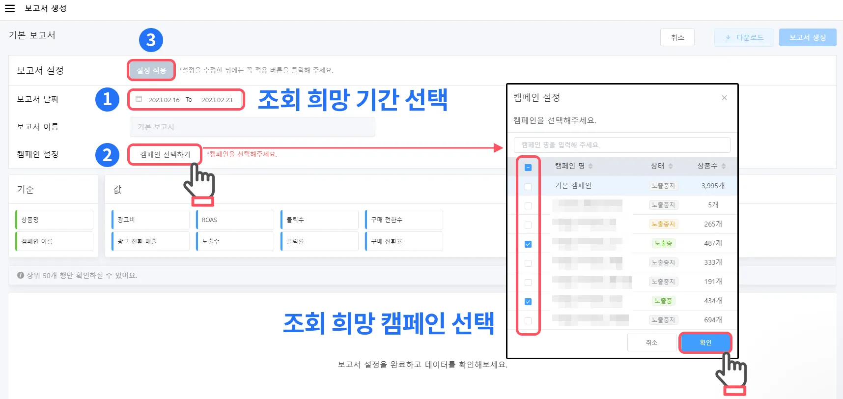 조회 희망 기간(1)/캠페인(3)을 선택 합니다.