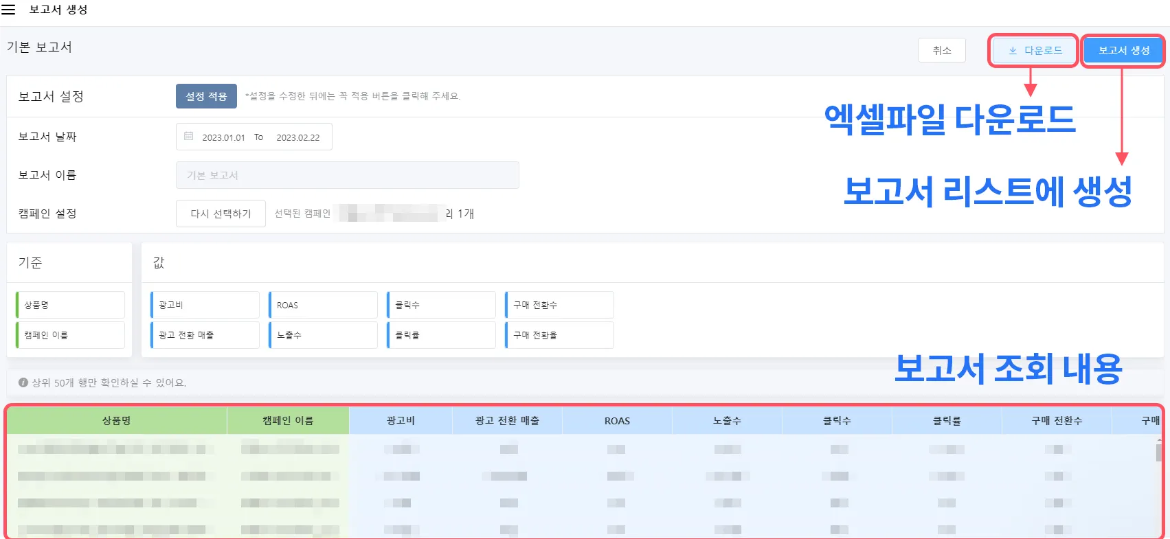 * 보고서 내용은 상위 50개 행만 확인할 수 있고, 전체 데이터는 엑셀 파일로 확인할 수 있습니다.