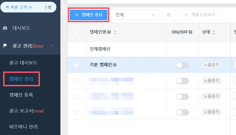 (주의) ‘캠페인 관리’ 에서 새 캠페인을 생성하셔야 합니다. (기본캠페인 아님)