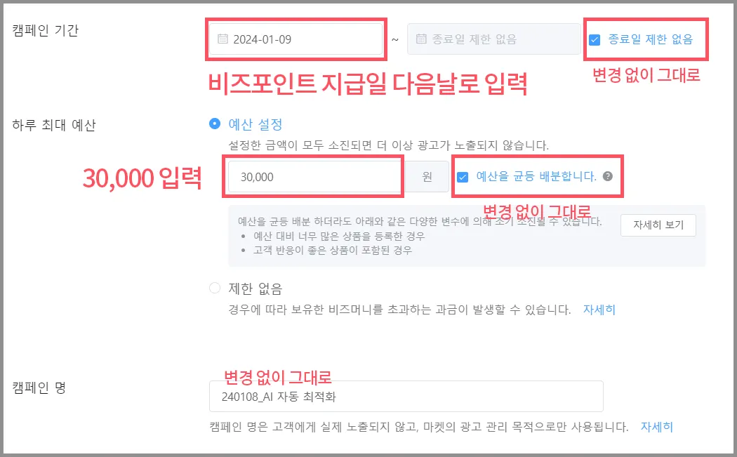 * 캠페인 설정 가이드 (하루 3만원 * 3일 사용)