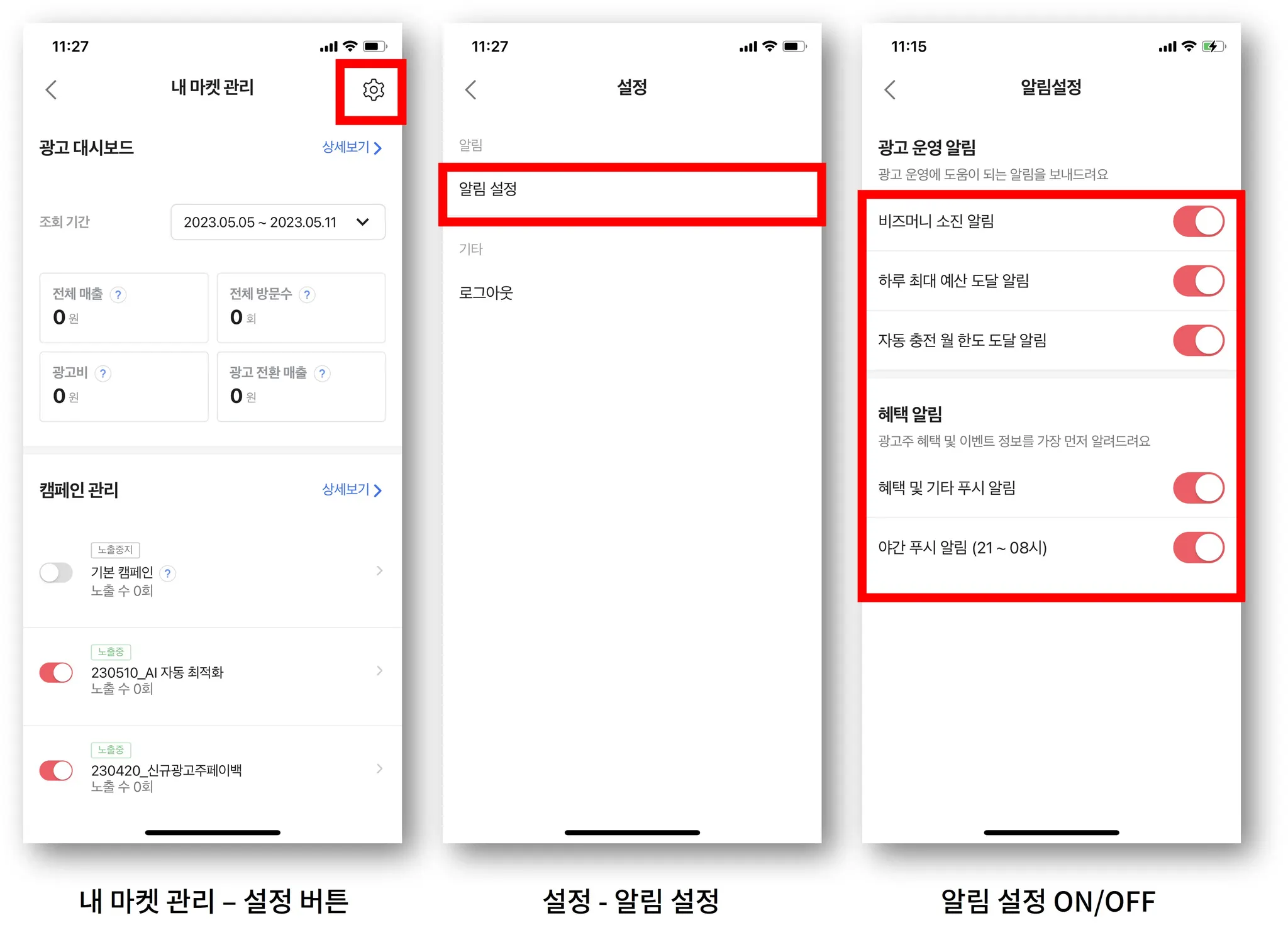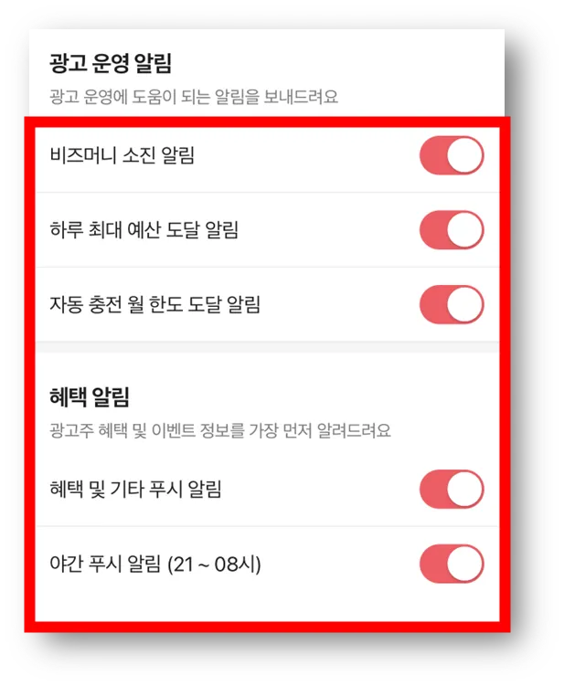 * 야간 푸시는 현재 비즈머니 소진, 하루 최대 예산 도달, 자동 충전 월 한도 도달 이 3가지 경우에 해당되는 경우에만 한정하여 발송되며, 향후 재설정할 수 있습니다.