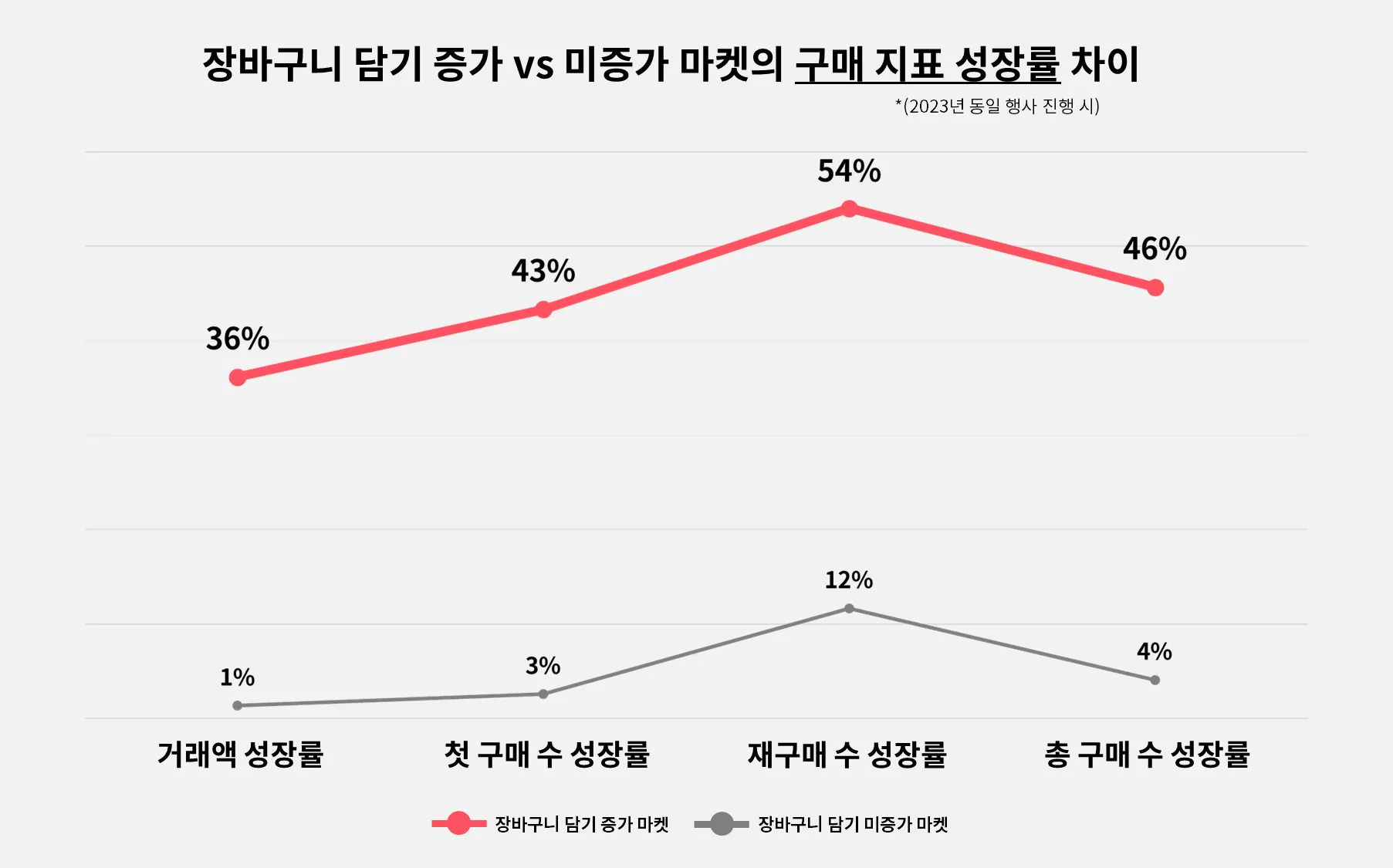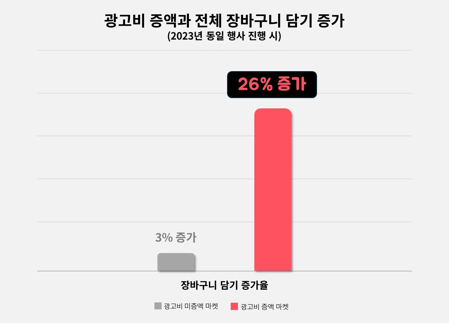 광고비를 증액한 마켓은 미증액 마켓에 비해 23%나 더 높은 장바구니 담기 증가율을 보였습니다.