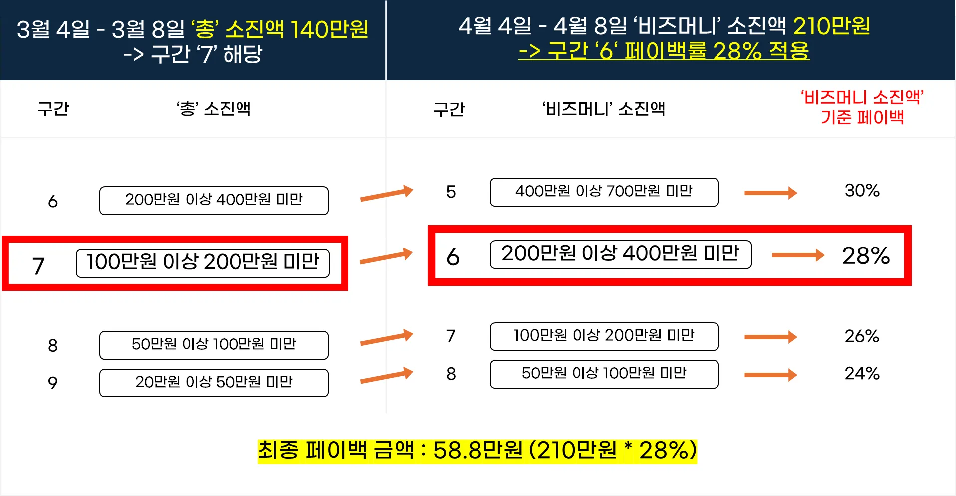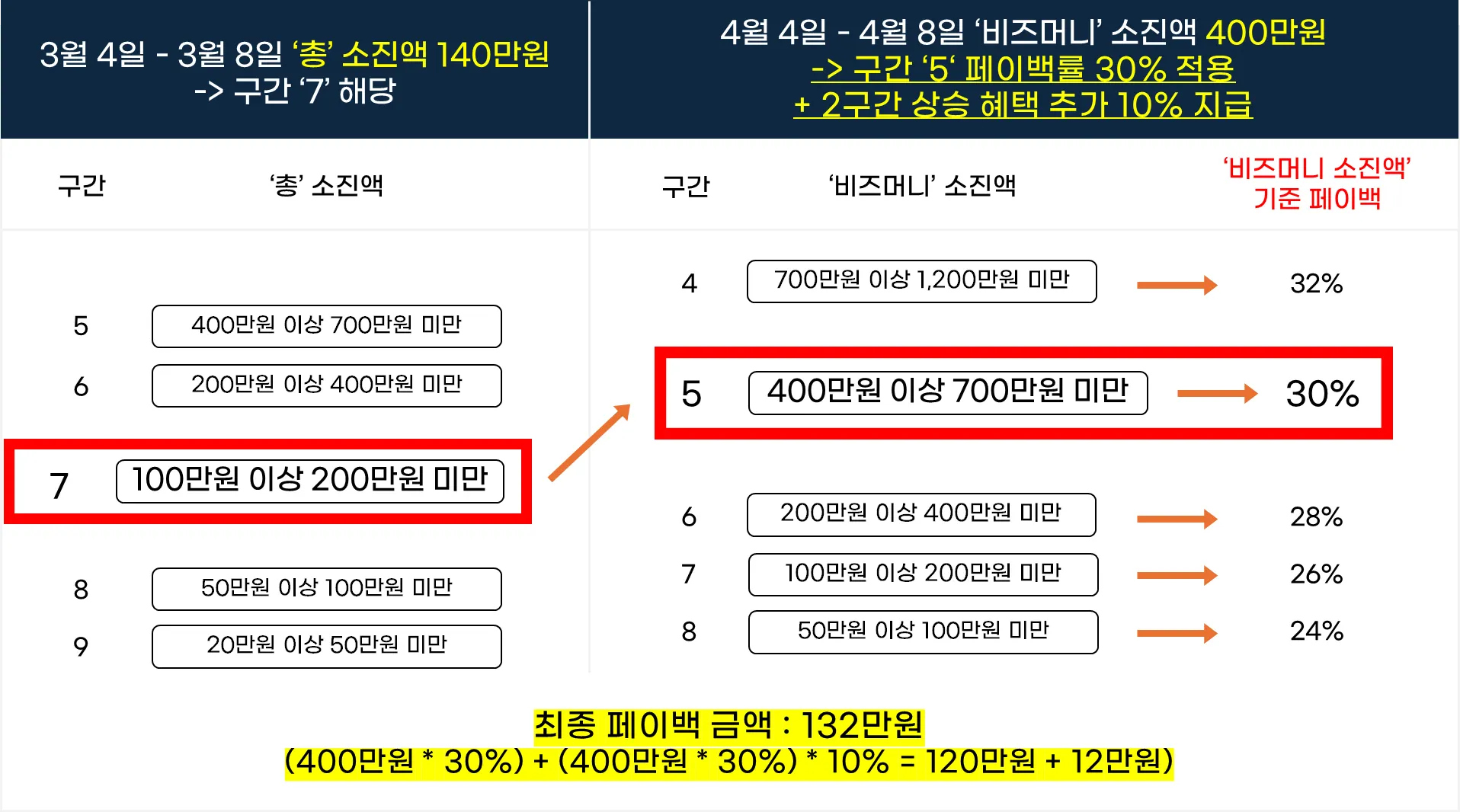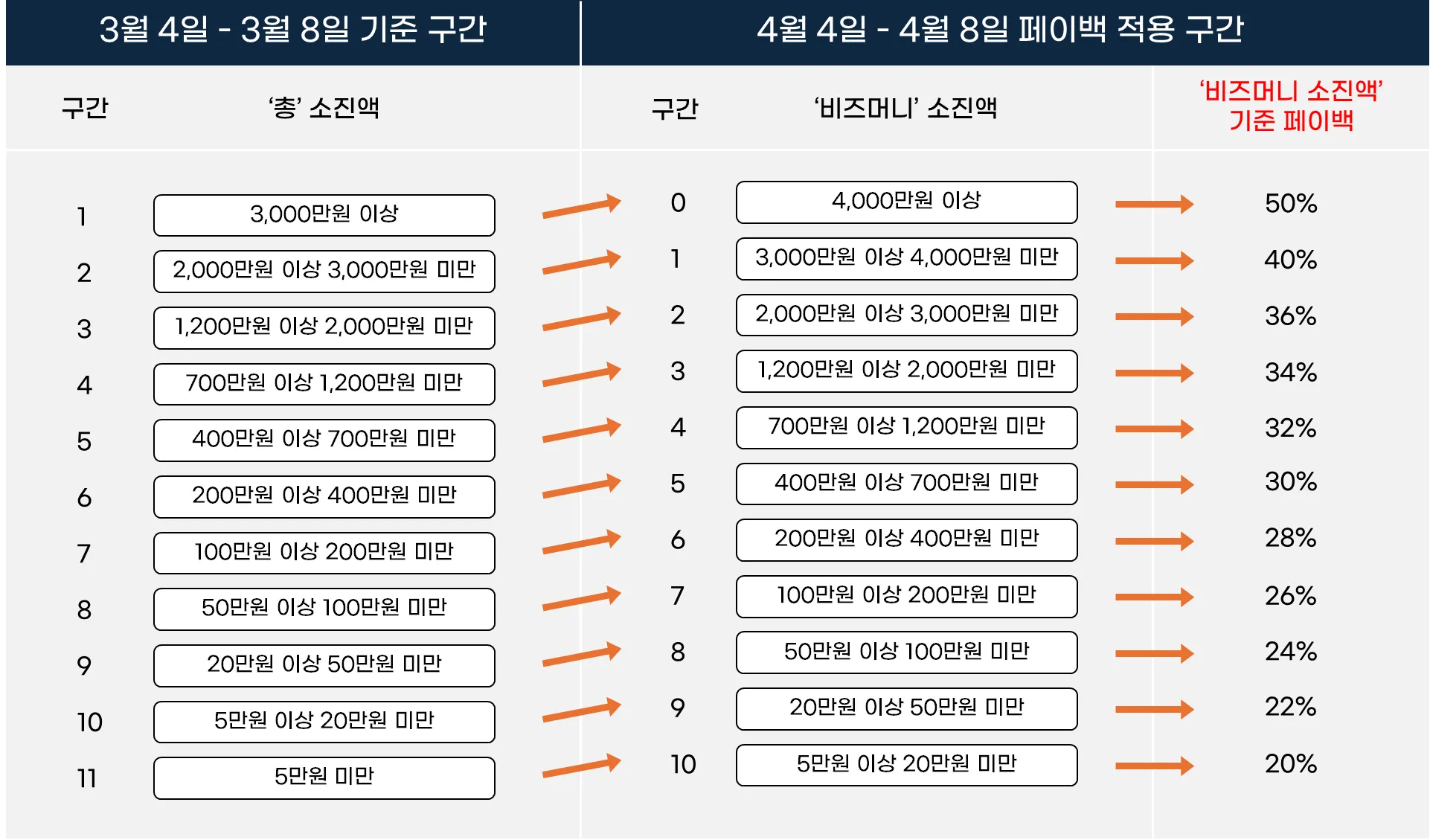기준 기간 ‘총’ 소진액 구간 대비 참여 기간 ‘비즈머니’ 소진액 구간이 반드시 1단계 이상 구간이 상승해야 페이백 대상이 됩니다.