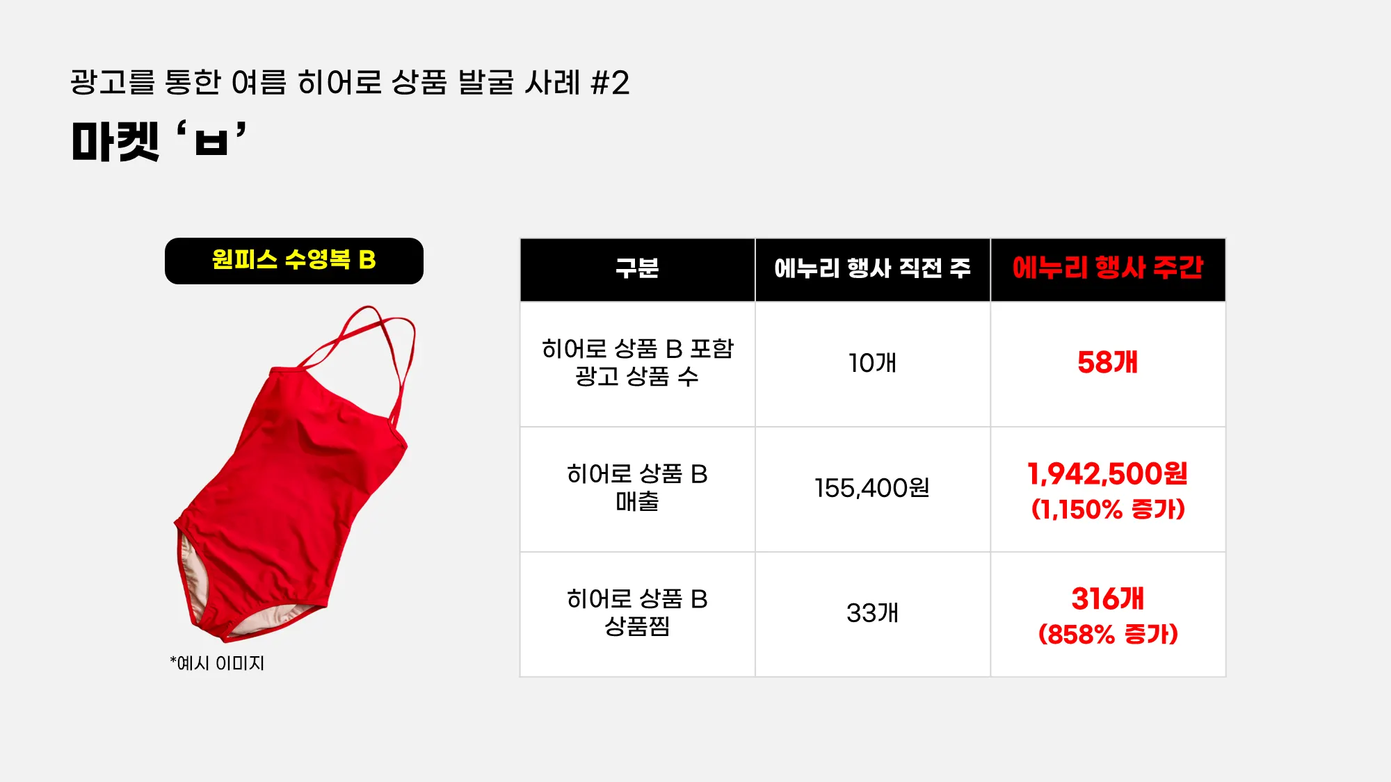 마켓 ‘ㅂ’은 행사 직전 주 10개의 상품만 광고하였으나, 행사 주간 48개의 여름 특화 광고 상품을 추가하였고, 여름 시즌 상품인 원피스 수영복 B를 새로운 히어로 상품으로 발굴했는데요!
