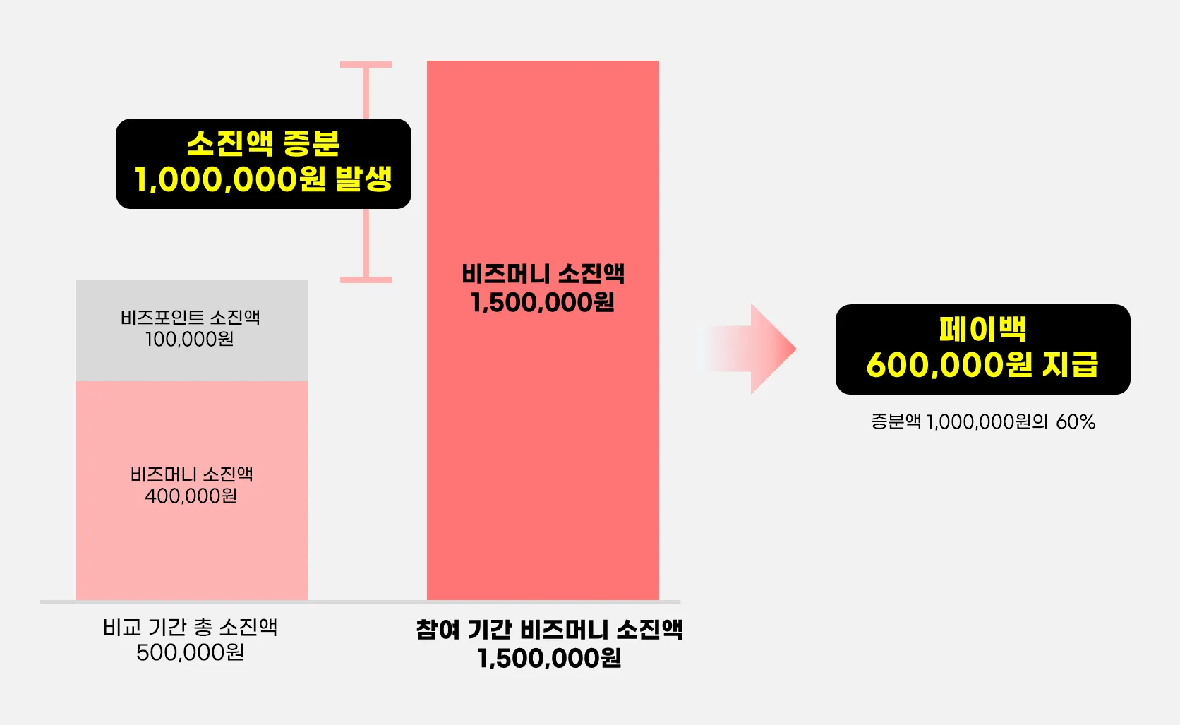 비교 기간 비즈머니 소진액과 비즈포인트 소진액을 합산한 총 소진액 대비하여 참여 기간 동안 비즈머니 기준으로 1원 이상만 더 소진하면, 더 많이 소진한 증분의 60%를 금액 제한 없이 페이백