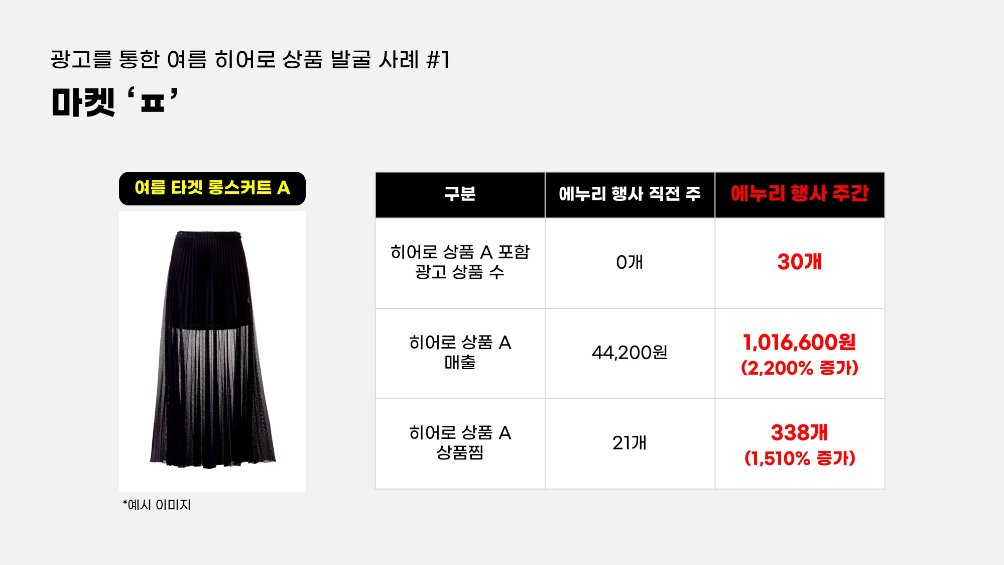 마켓 ‘ㅍ’는 행사 직전 주 광고를 진행하지 않았으나, 행사 주간 30개의 여름 특화 광고 상품을 추가하여 진행한 결과 여름을 타겟한 롱스커트 A를 새로운 히어로 상품으로 발굴했습니다.