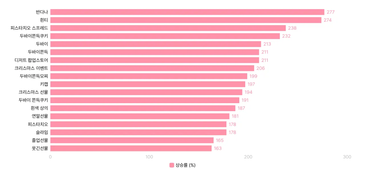금주 급상승 키워드 : 반다나, 흰티, 피스타치오, 두바이, 쫀득 쿠키, 모찌, 선물