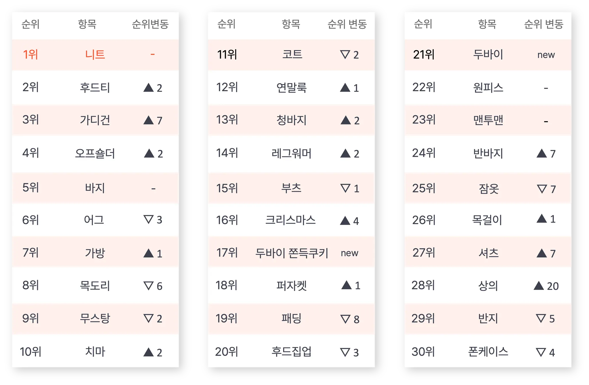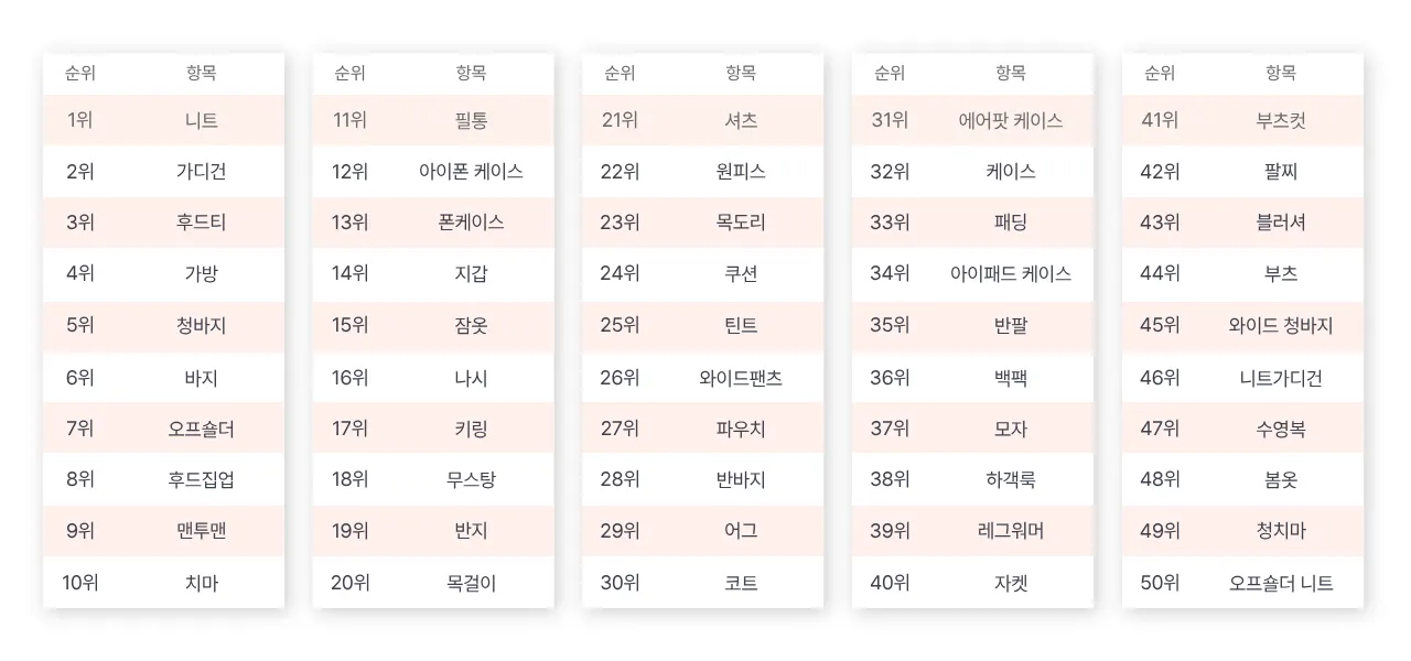 금주 인기 키워드: 두바이 쫀득쿠키, 반바지, 셔츠, 니트, 후드티, 가디건, 오프숄더