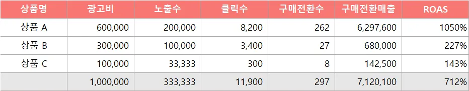 광고비는 많이 나가는데, 매출 기여도가 높지 않는 상품이 있을 수 있습니다.