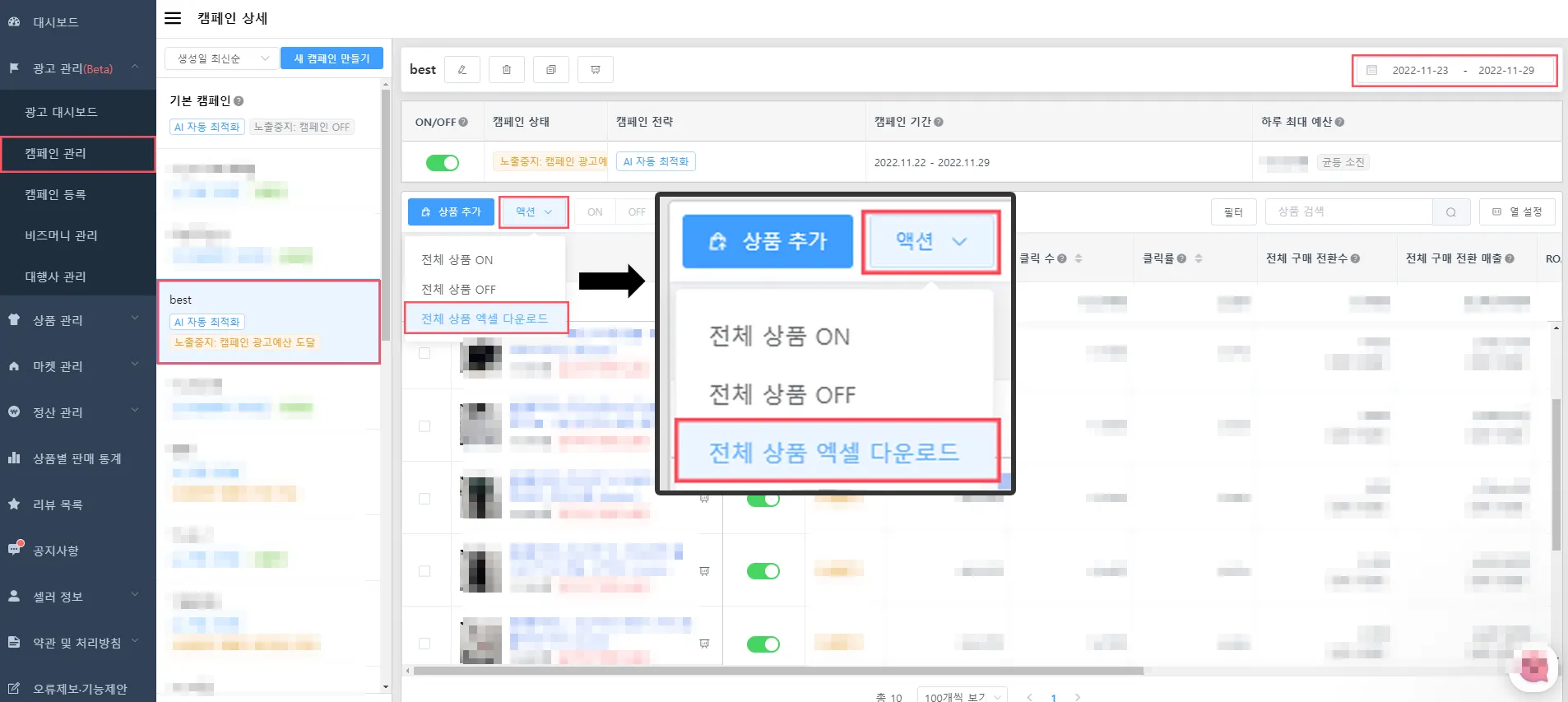 [광고 관리] → [캠페인 관리] → [캠페인명] 클릭 → [액션] 버튼 클릭 → [전체 상품 엑셀 다운로드]