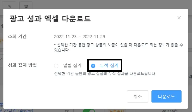 입별 집계, 누적 집계 둘 중 선택하여 자료를 다운로드할 수 있습니다.