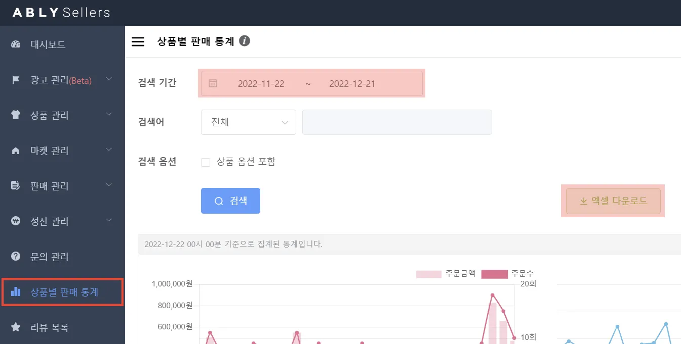 * 셀러 어드민 - 상품별 판매 통계에서 상품별 주문수/주문금액을 확인할 수 있습니다.